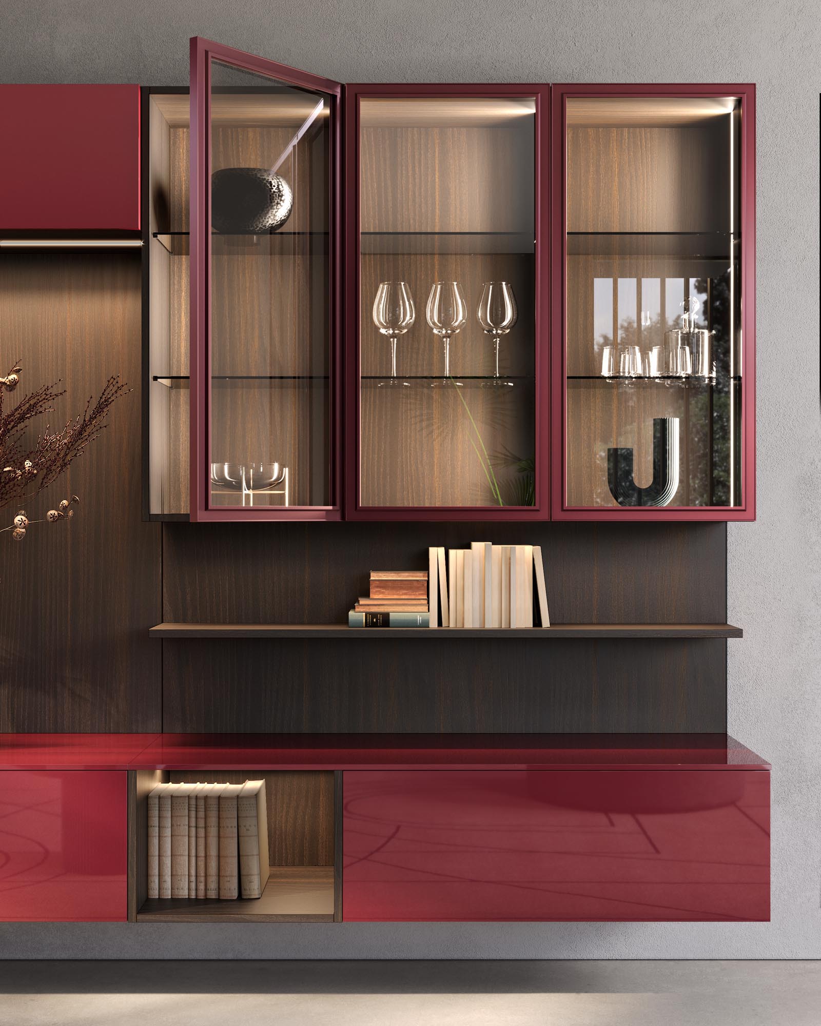 The wall units, featuring Evans AIR metallic lacquered aluminum doors Amarena finish and fumรฉ glass, are internally equipped with fumรฉ glass shelves, perfect for displaying books, design objects, and wine glasses.