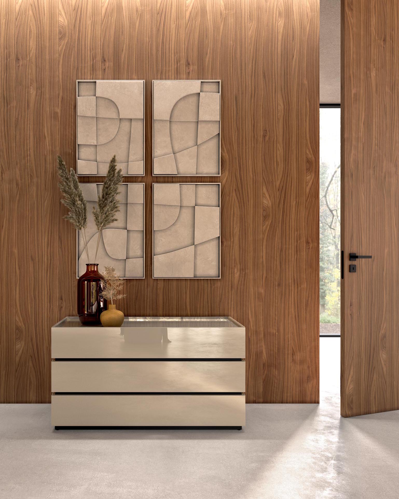 Flat is the collection of wall panels by Guzzini e Fontana featuring completely flat doors. It’s available in all bilaminate, matte and gloss lacquers, smooth metal and brushed metal lacquers, veneers, and wood veneers exotic finishes. It can be used to cover doors, customized with mirrors and shelves, and enhanced with LED lighting.