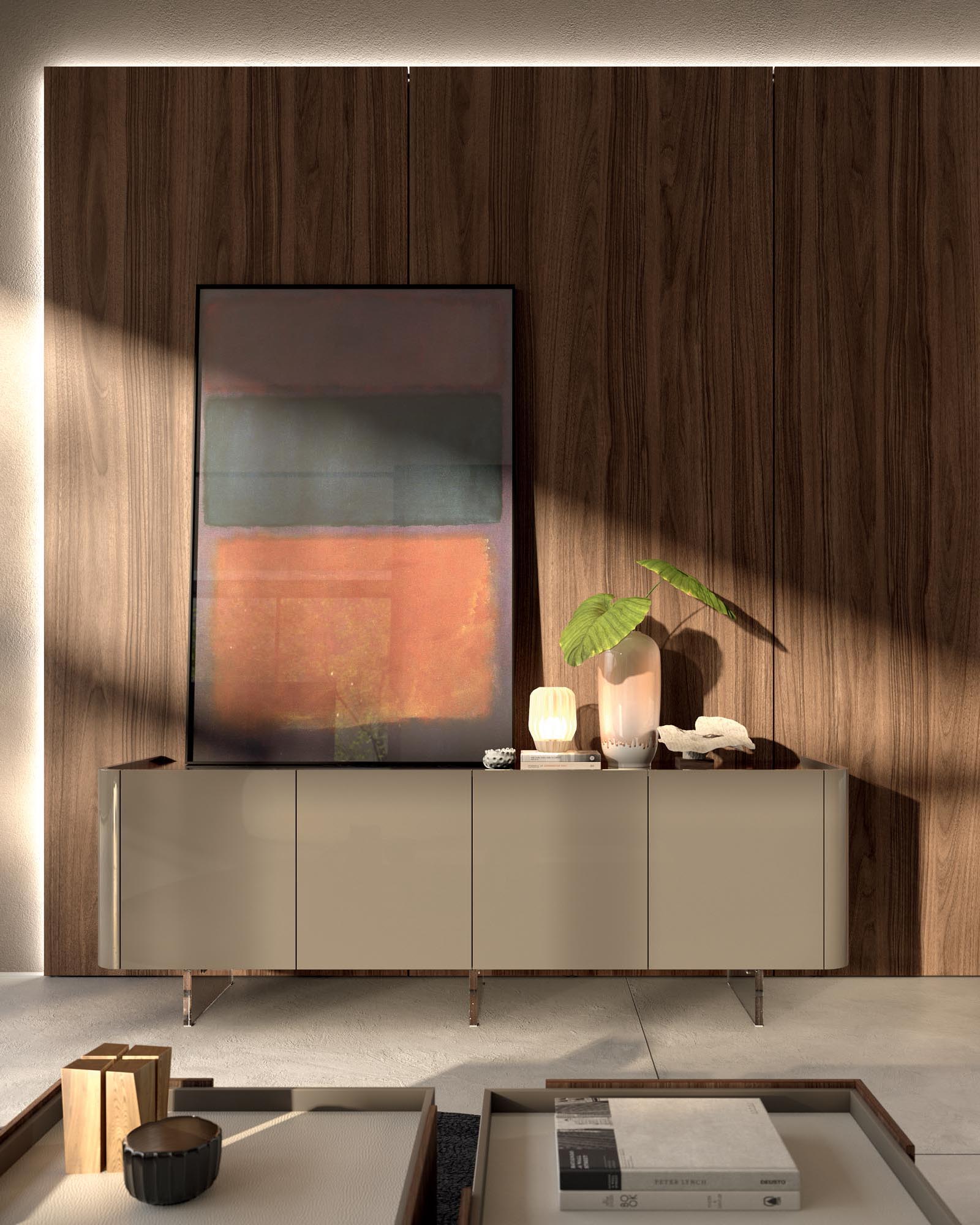 Lovie is a sideboard with rounded edges supported by Floating, an invisible base. It’s inspired by the nickname of Cora Austin, one of the first women to lead a male orchestra in the 20th century.