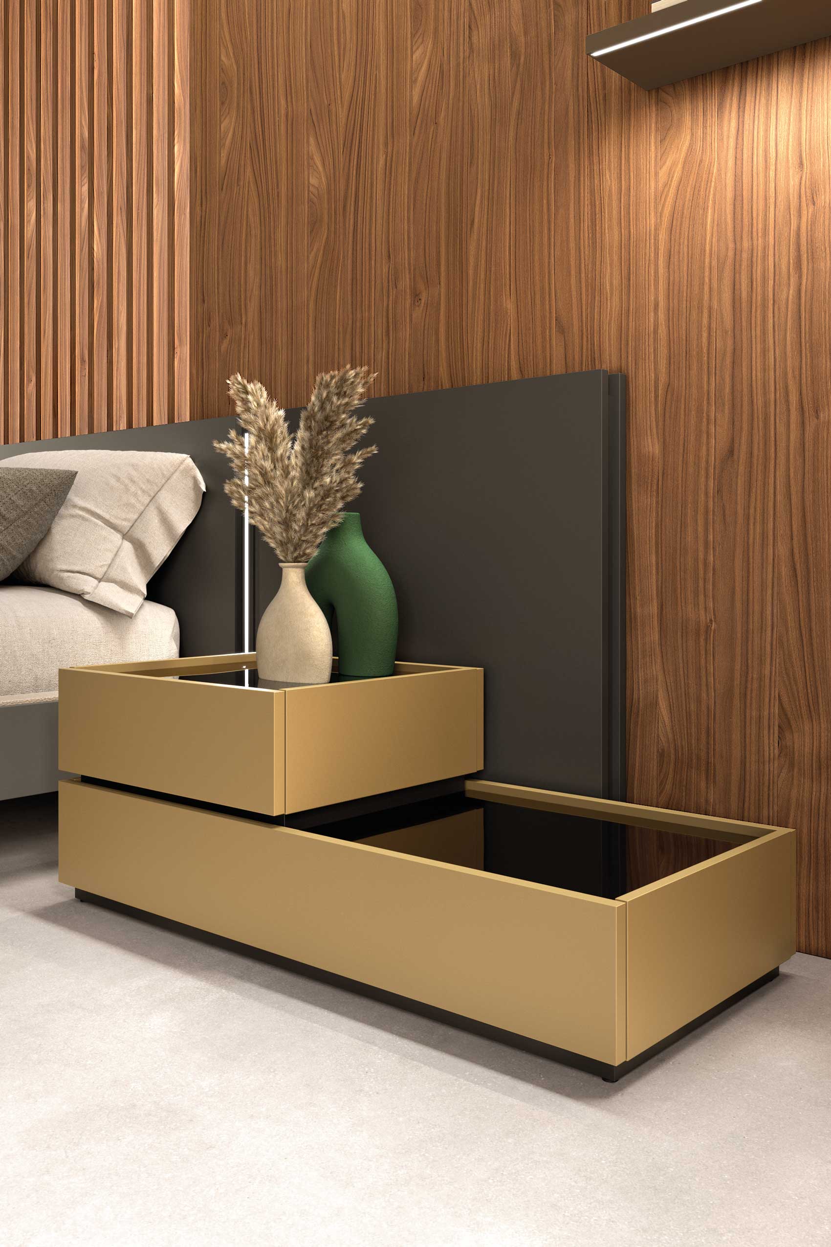 The warmth of the Walnut wood panelling gives the room a sense of cosiness, while the lightness of the Koko complements and the suspespacension of the Dizzy bed enrich a timeless.