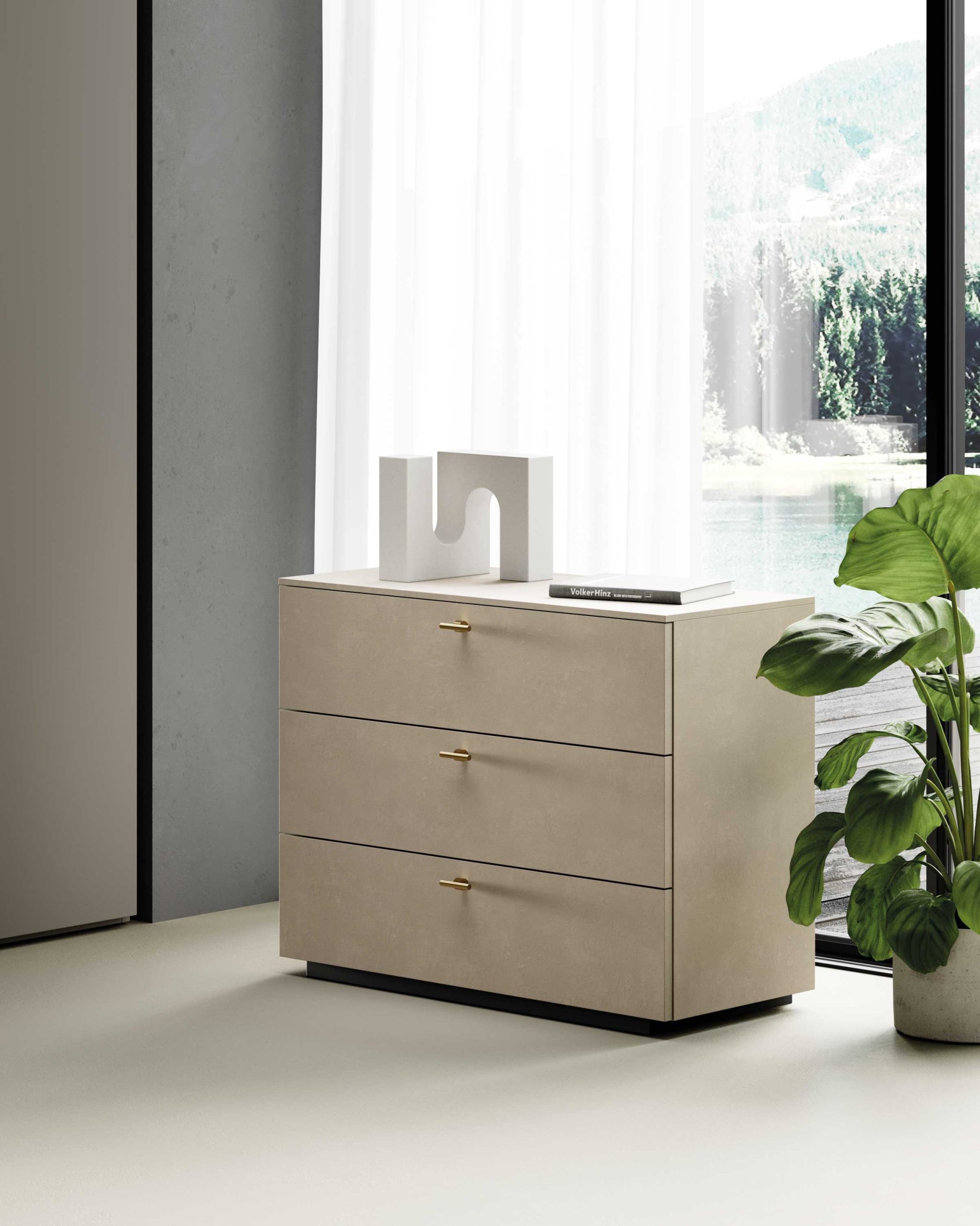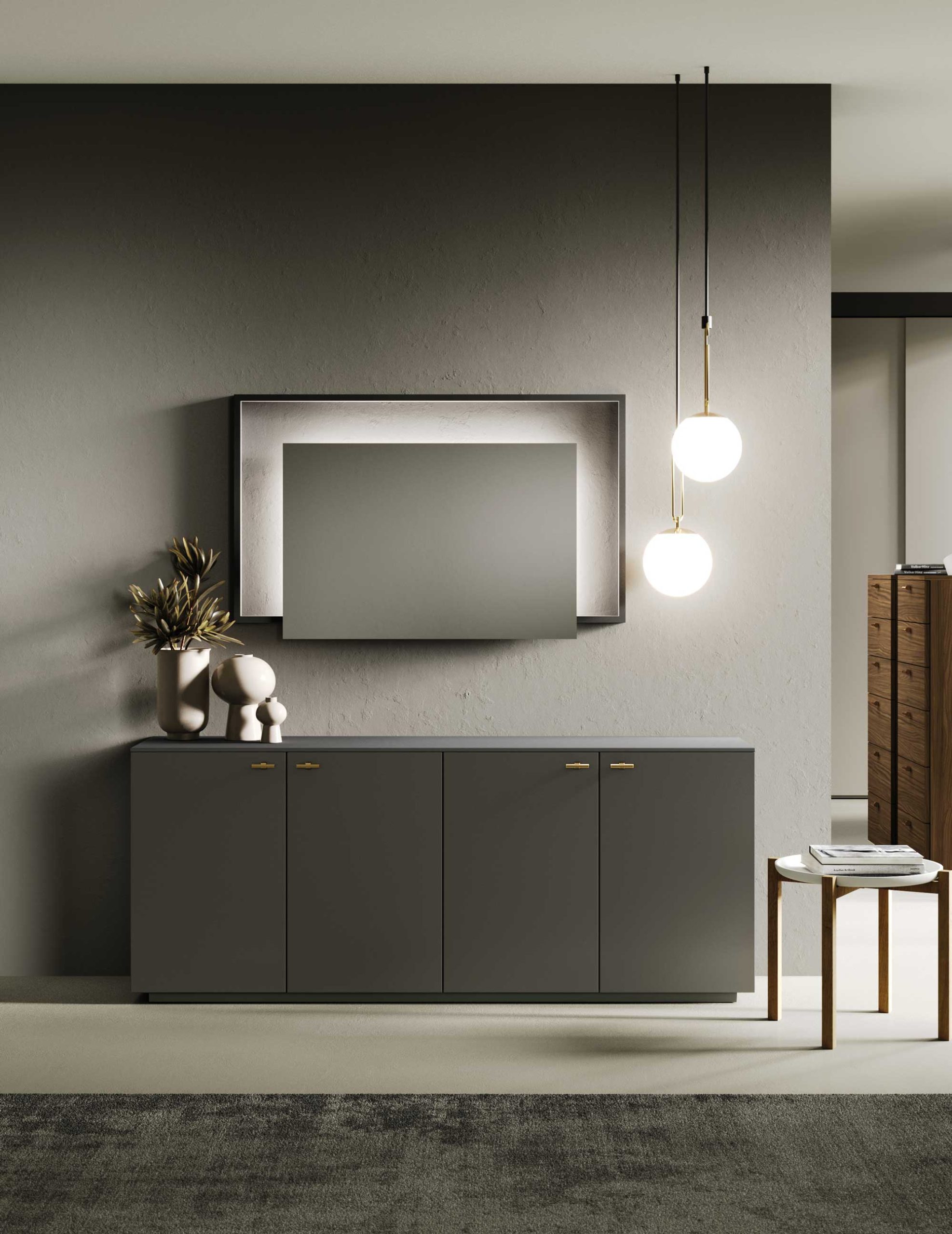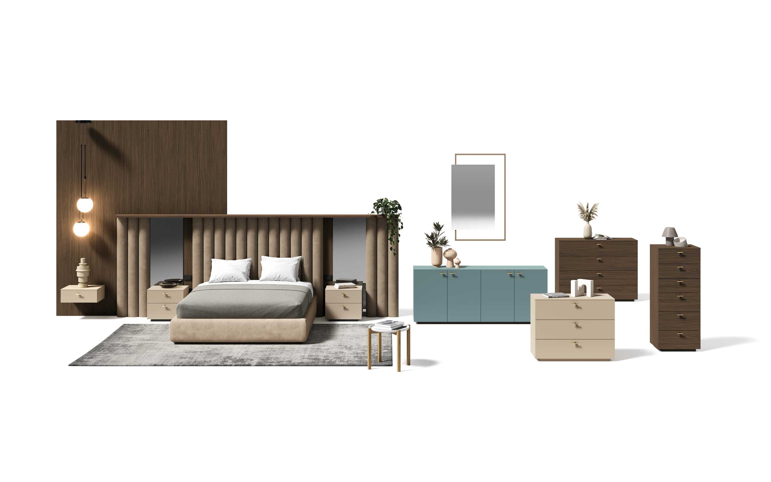 The rhythm of the curves given by the headboard of the Arabesque bed dominates the scene. Fluid and ethereal volumes contrast with the rationality of the Bix complements.