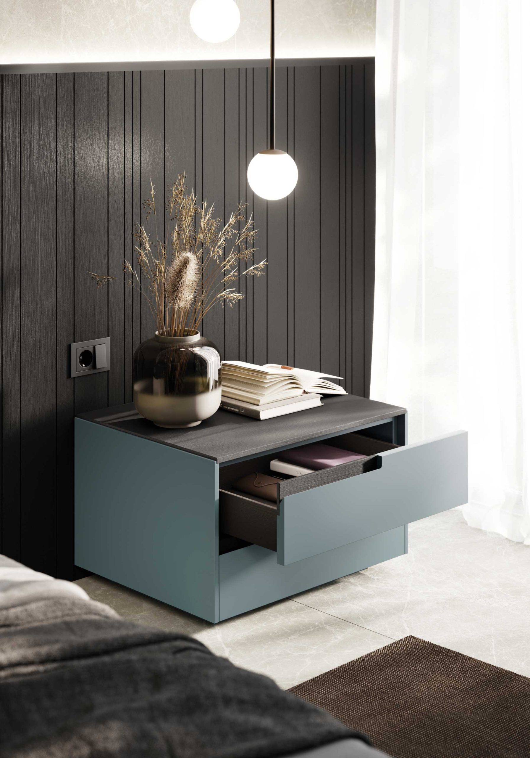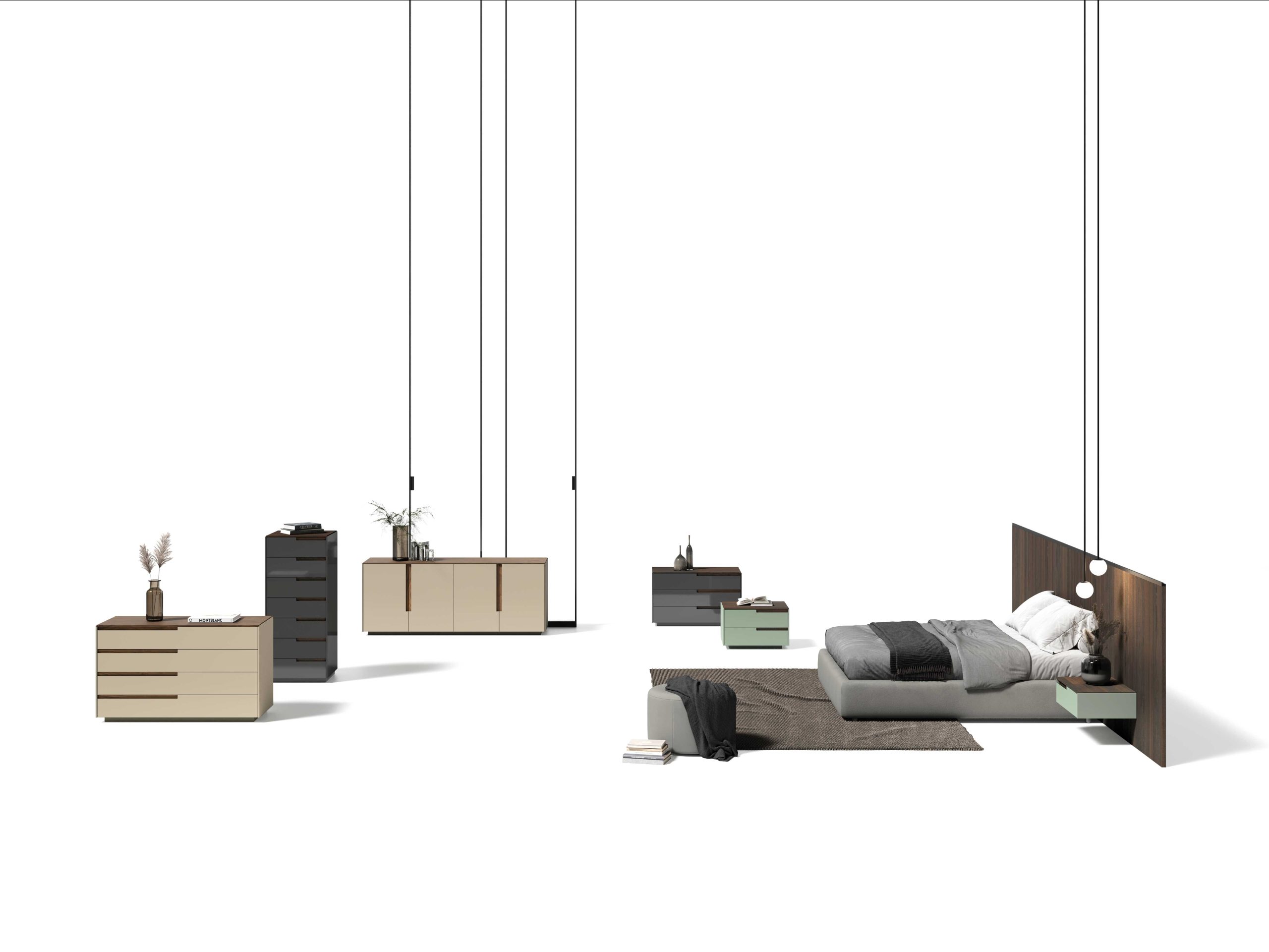 Up-stage nightstands in matt lacquer with integrated wooden handle.