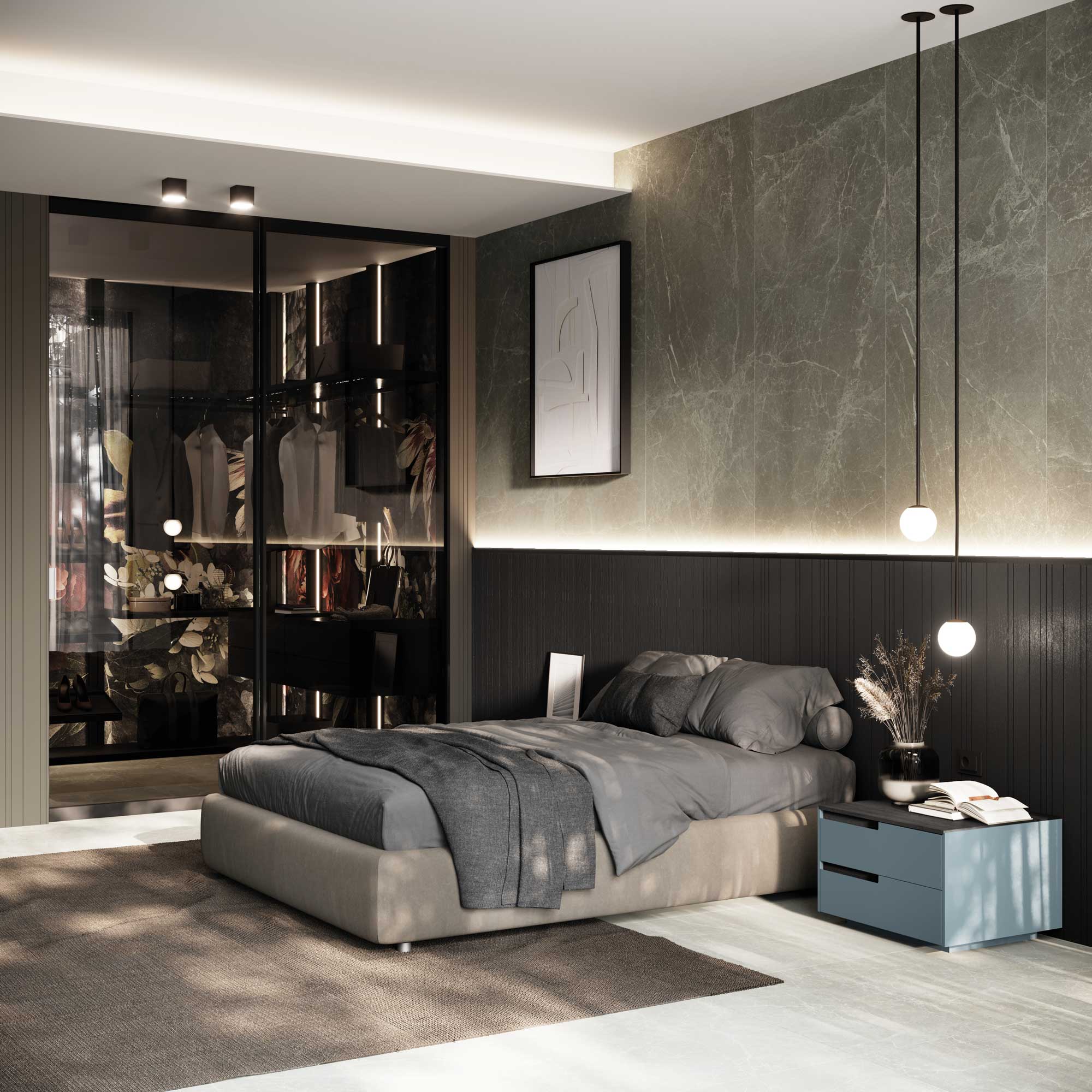 Wall covered with Tempo slatted wall panelling in matt lacquer and wooden top, Stage bedside table and Boogie mirror.