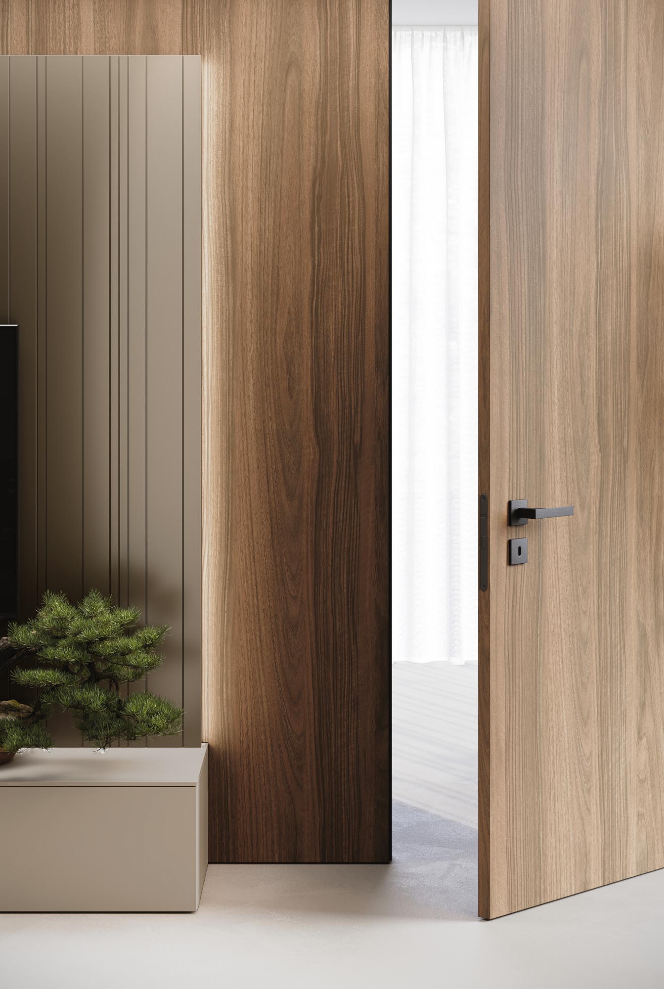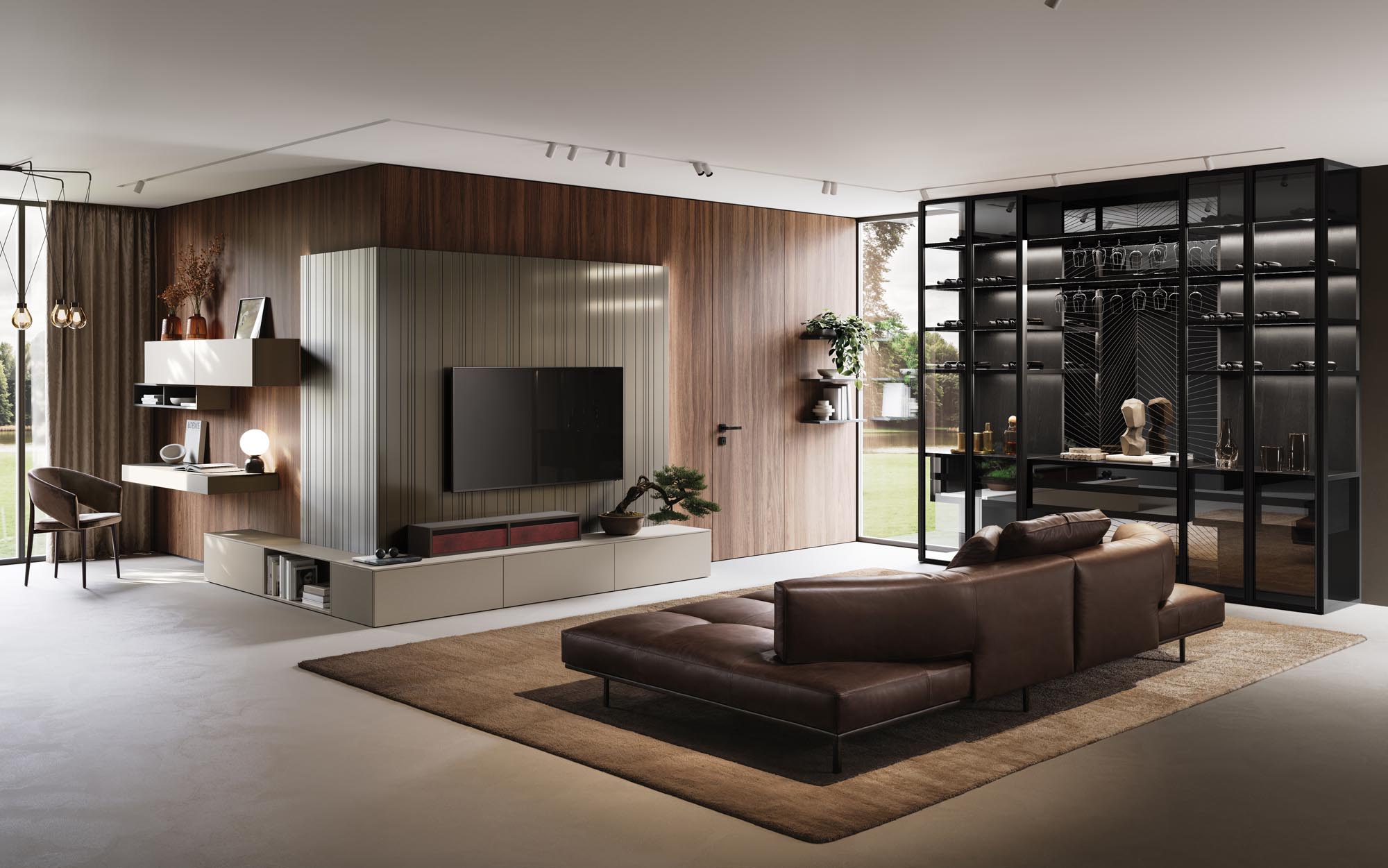 Full-high FLAT boiserie and ESP CORE door in bilaminate Noce AM. Projecting TEMPO boiserie with Led on sides and top FOLDING in matt lacquered Mercurio f inish. Cabinets in matt lacquered Visone and open space module in Grigio antracite matt finish.