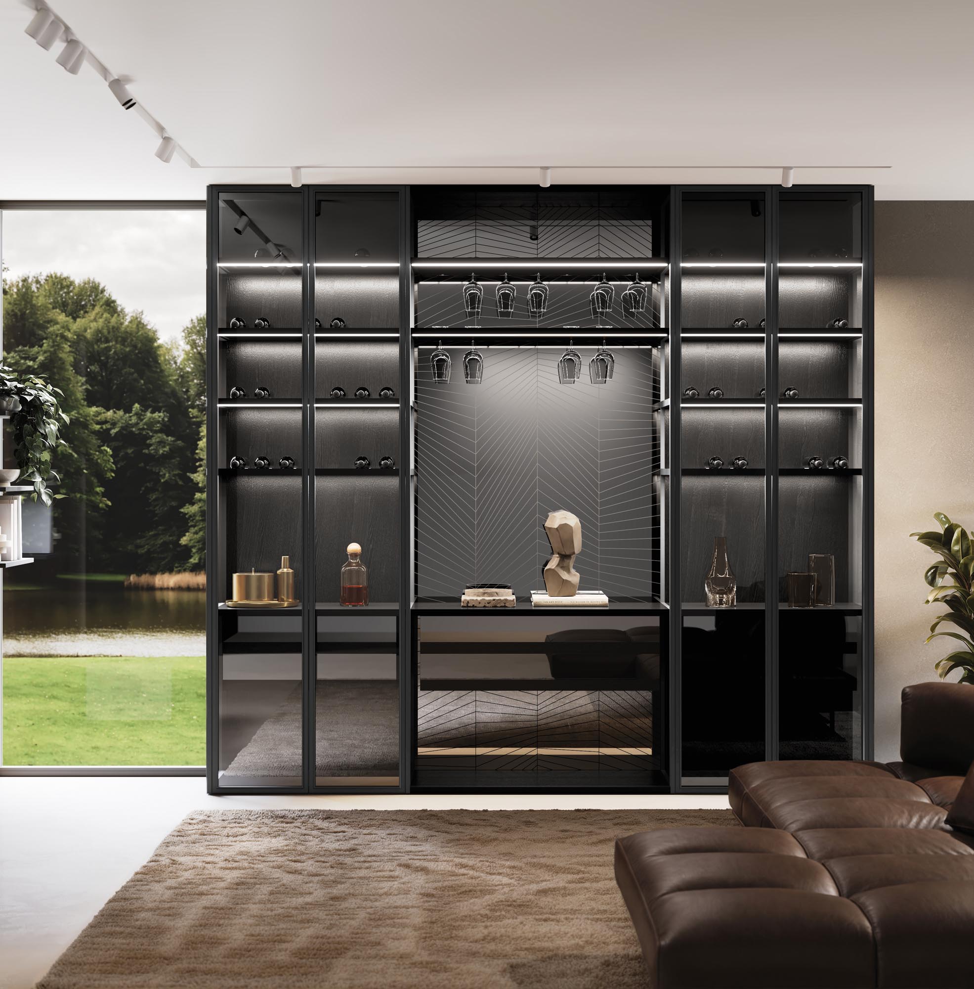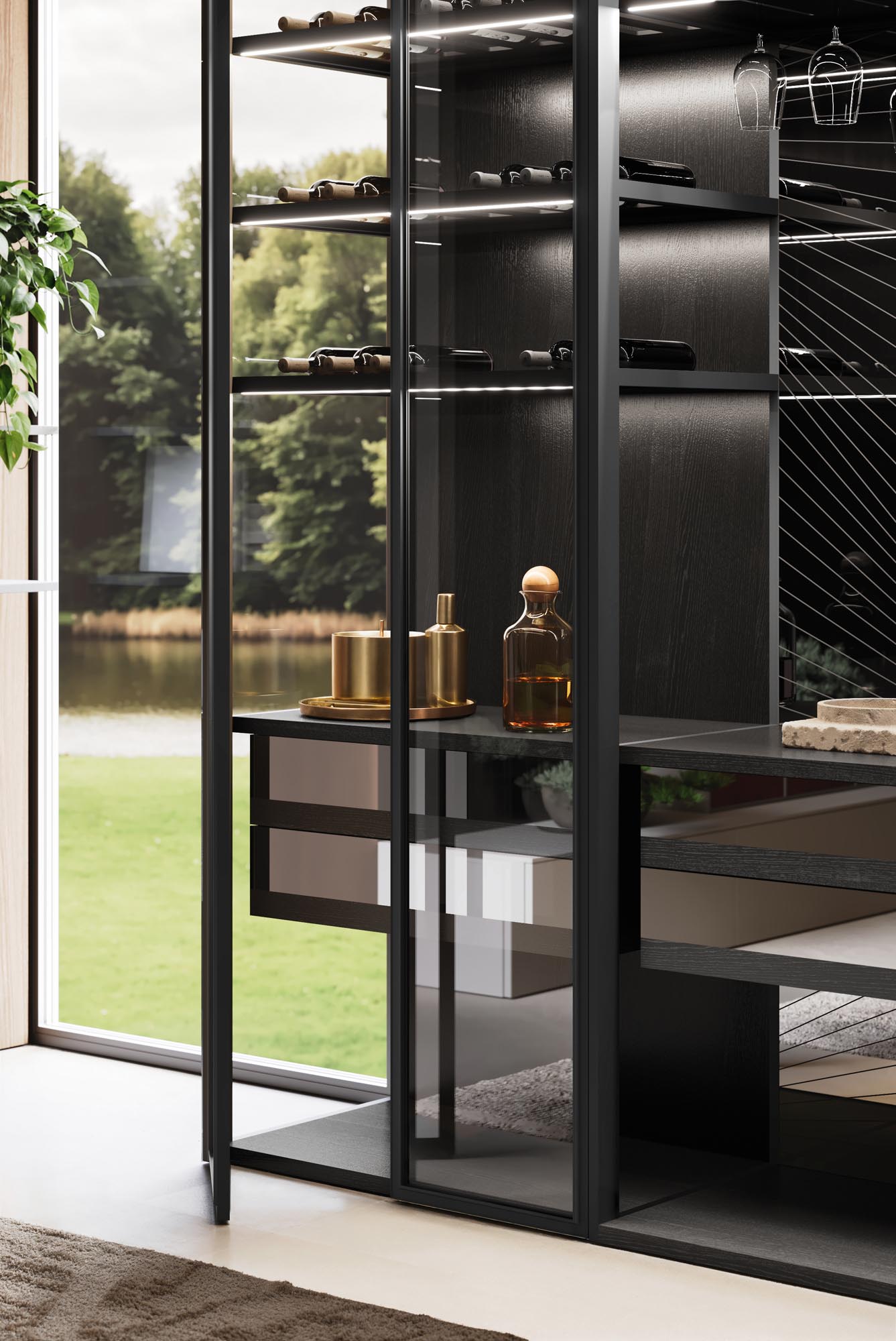 NAKED system with frame partition and EVANS AIR doors in aluminum black matt finish and Fumรจ glass. Back central panel in glass with decoration Wire, back panels on sides in veneer Frassino BL f inish. Shelves for bottles and goblets in black matt aluminum with Led lighting.