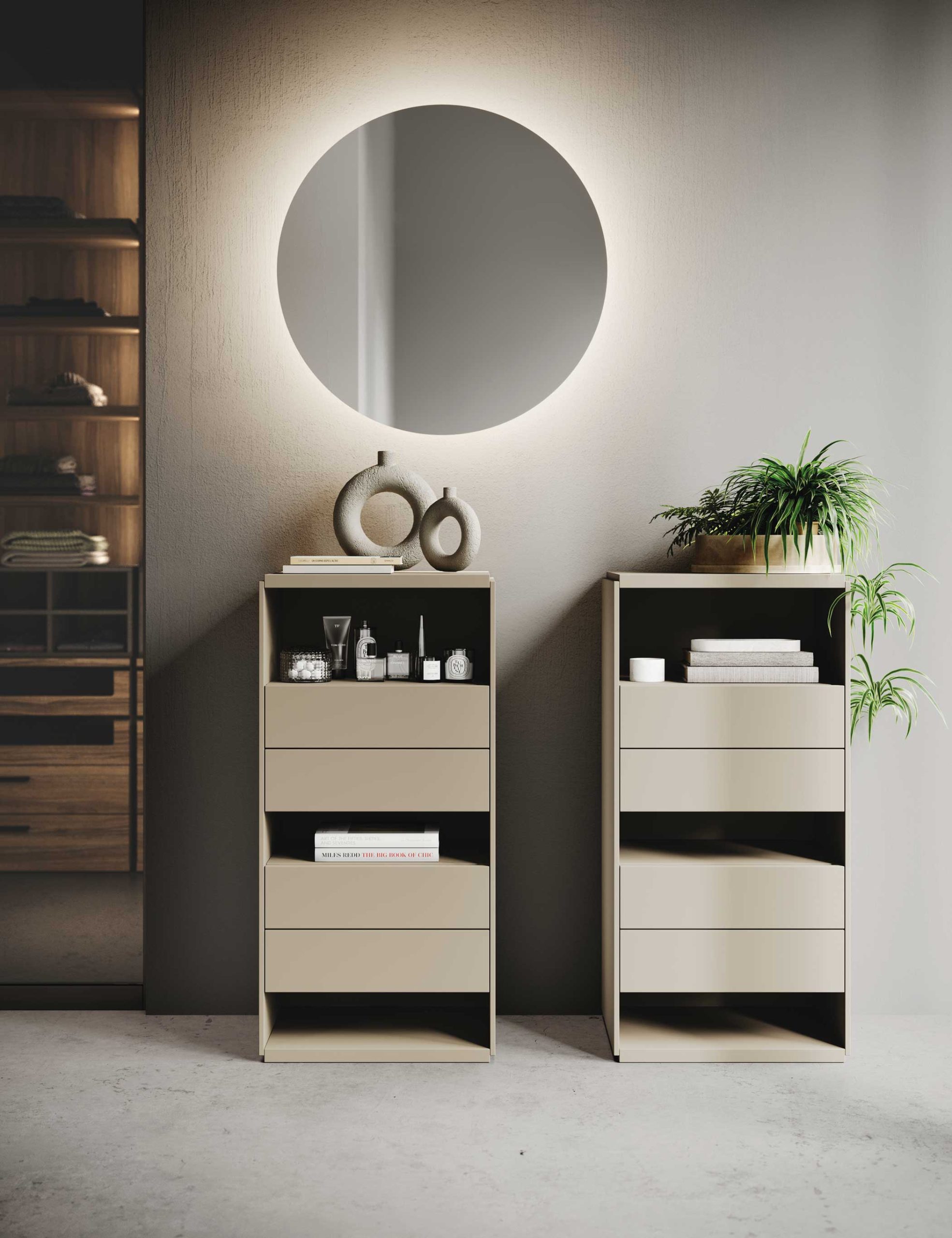 The succession of partitions of the Neverstop walk-in closet at a constant pitch generates a fascinating game of solids and voids enhanced even more by the vertical LEDs. The scene is also characterized by the metal doors of the Flat wardrobe that alternate with light wood that gives warmth and harmony.