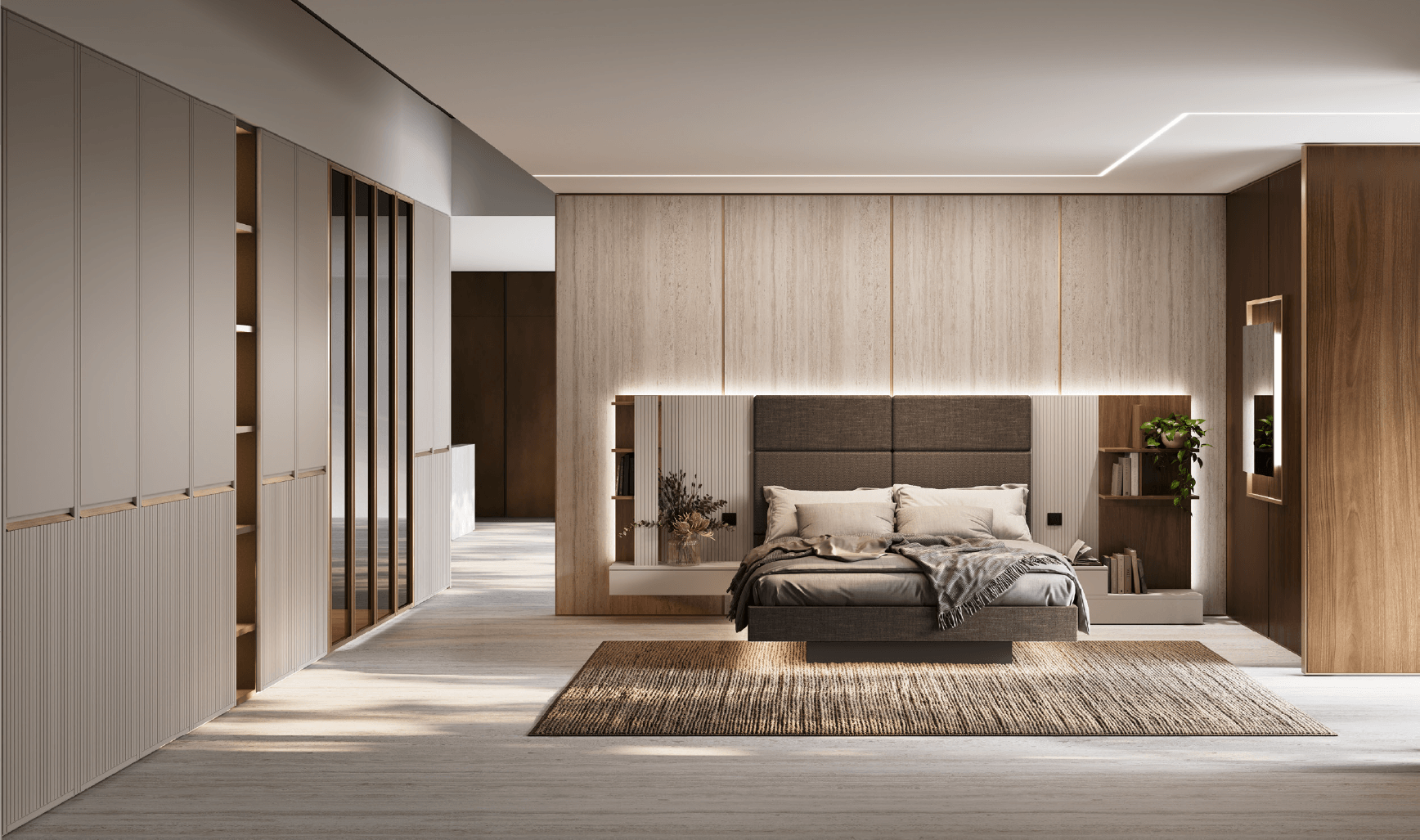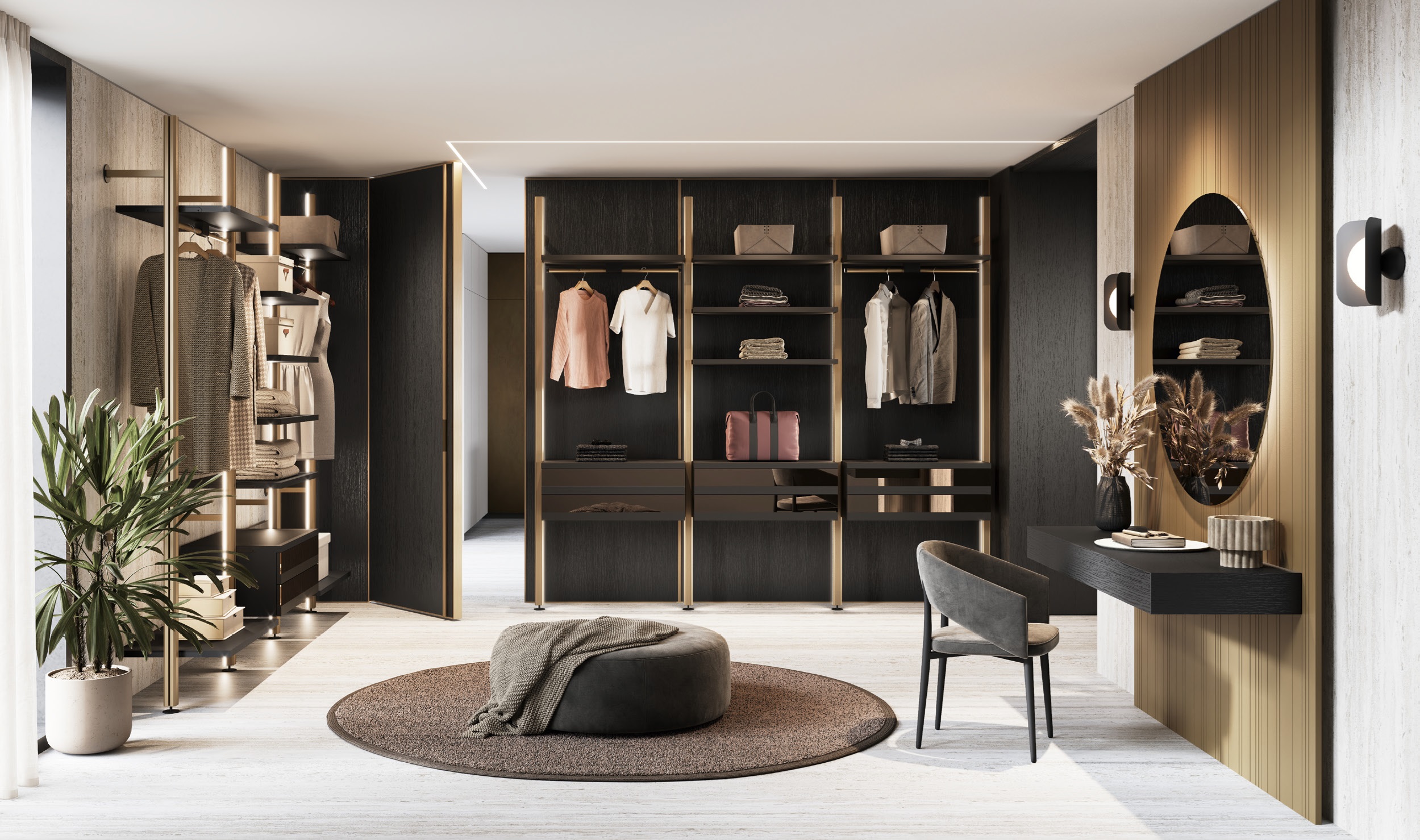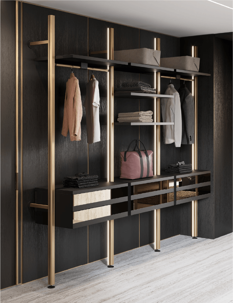 In the back Modwall partitions with bronze aluminium frame and bilaminate wood panels Rovere nero finish.