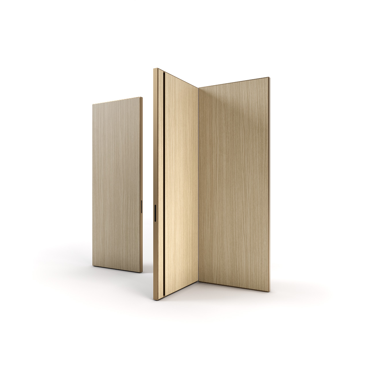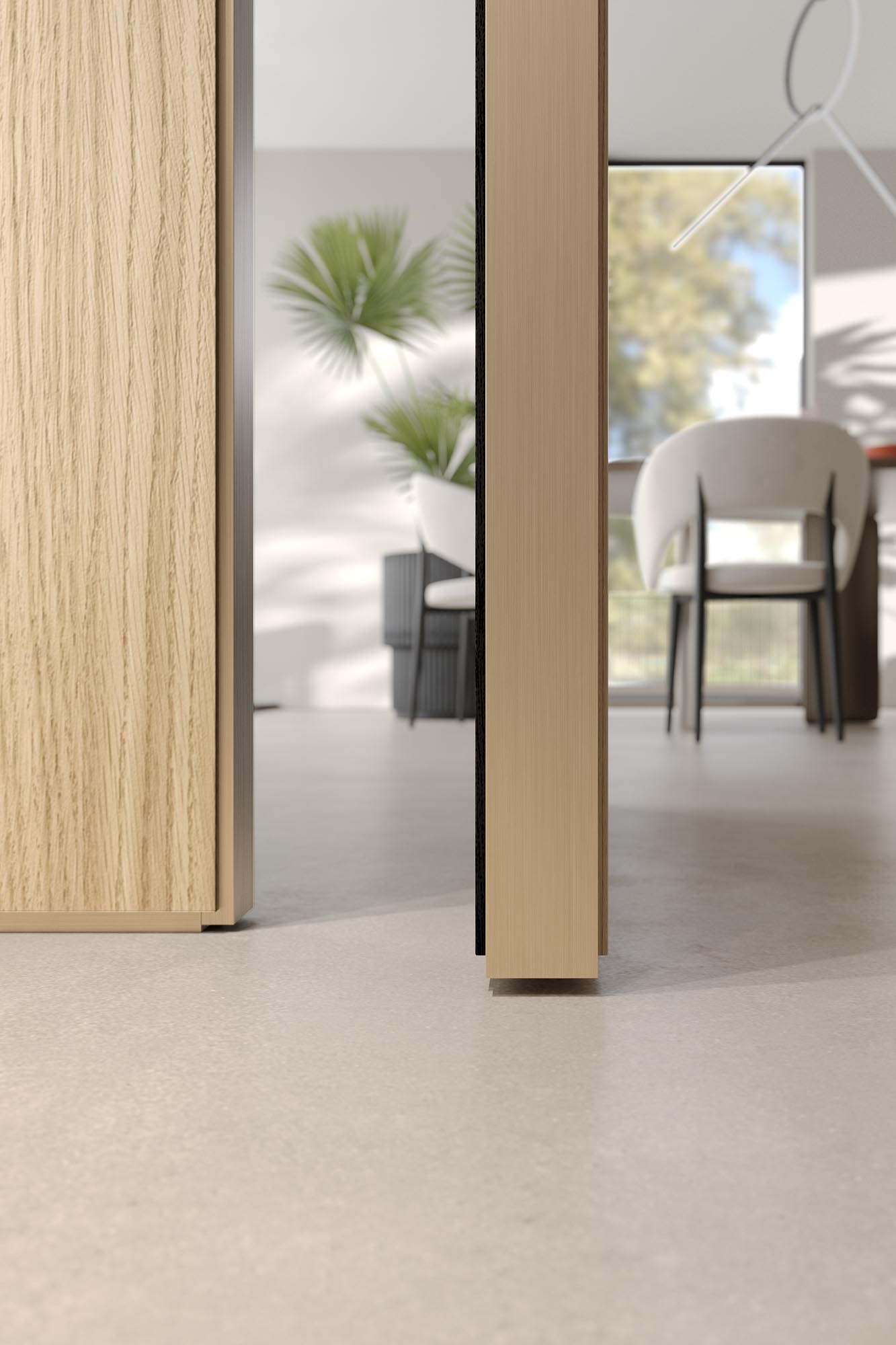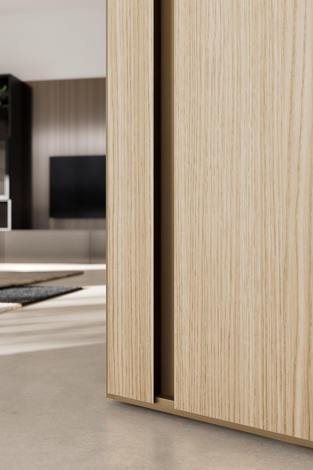 This is a self-supporting partition wall with a thickness of 72 mm consisting of an aluminum frame that forms the structural element and two panels from the boiserie collection, one at the front and one at the rear, which when joined together create a space inside for cable passage.