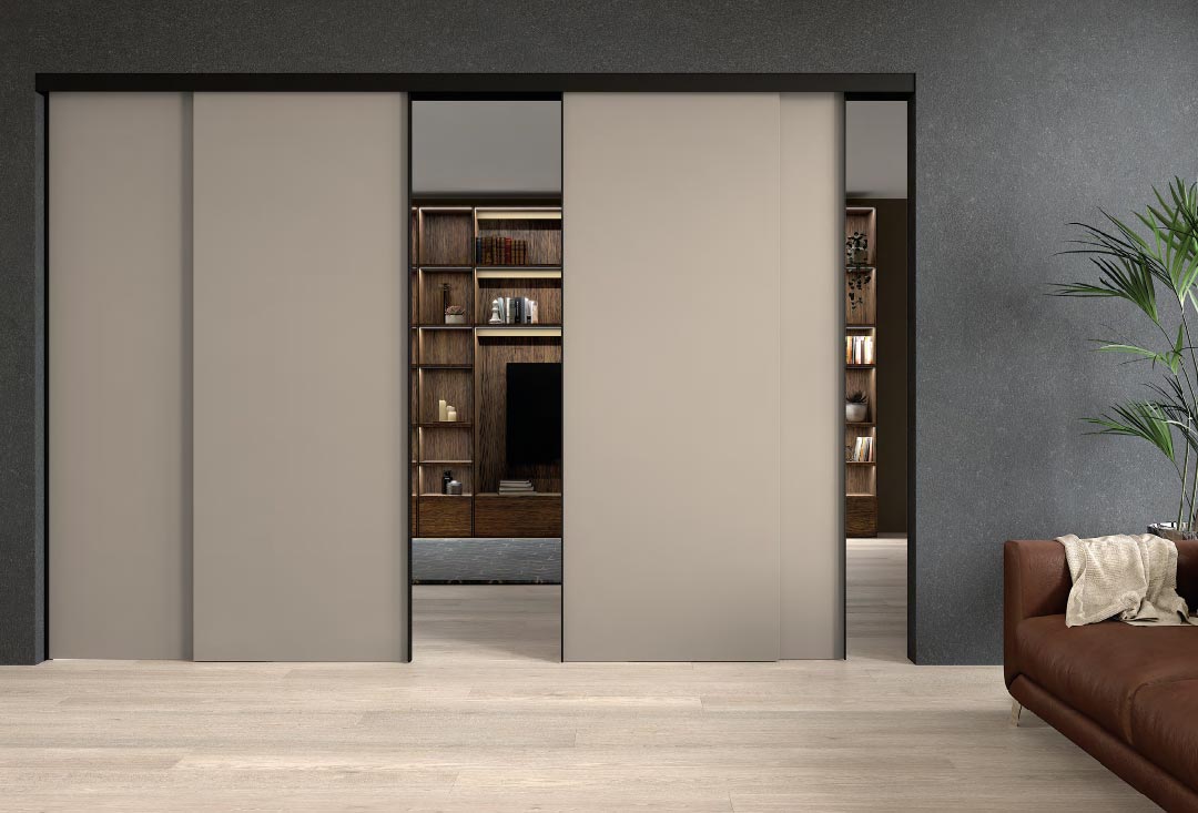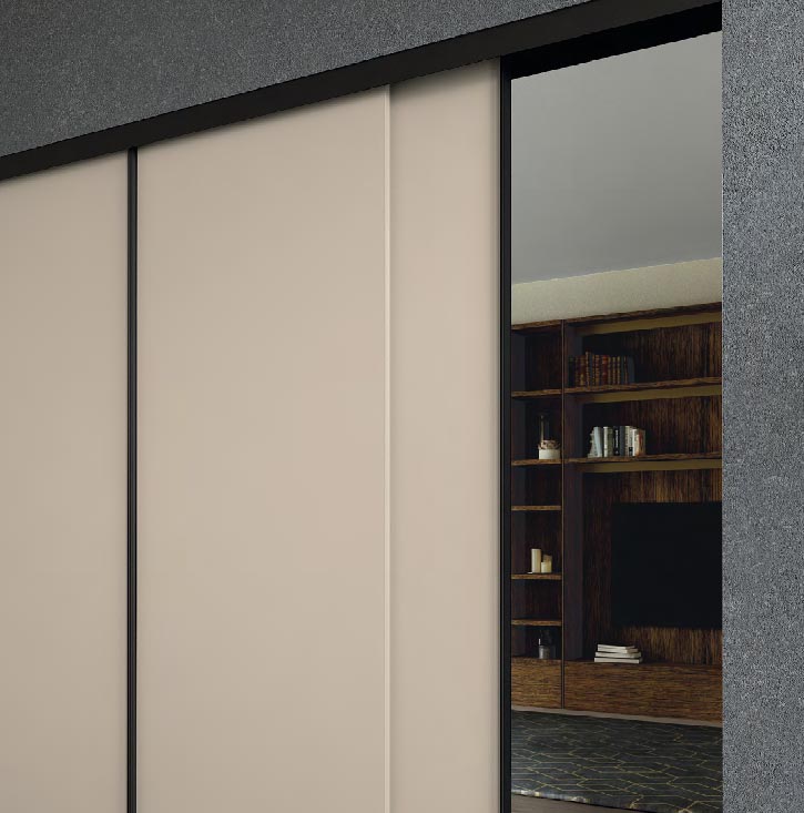 Bilaminate sliding doors, thickness 19/30 mm. Available handles: Reflections, Gap and Hollow. Available only one-way track.