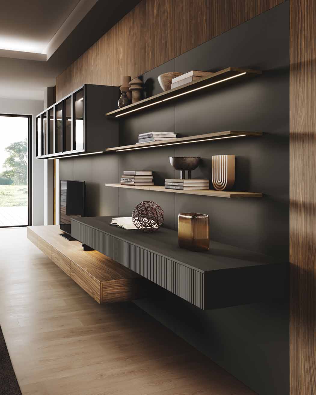 Living wall in matt lacquered finish, Evans air wall units with aluminum frame and glass, boiserie panels in wood.