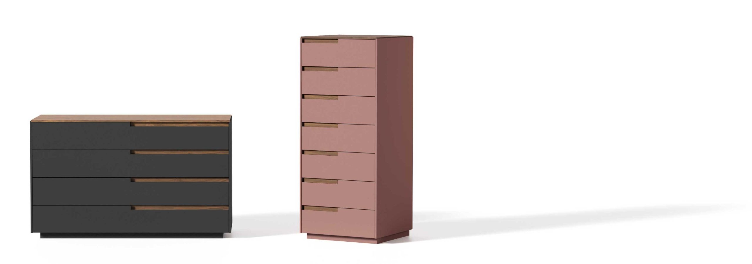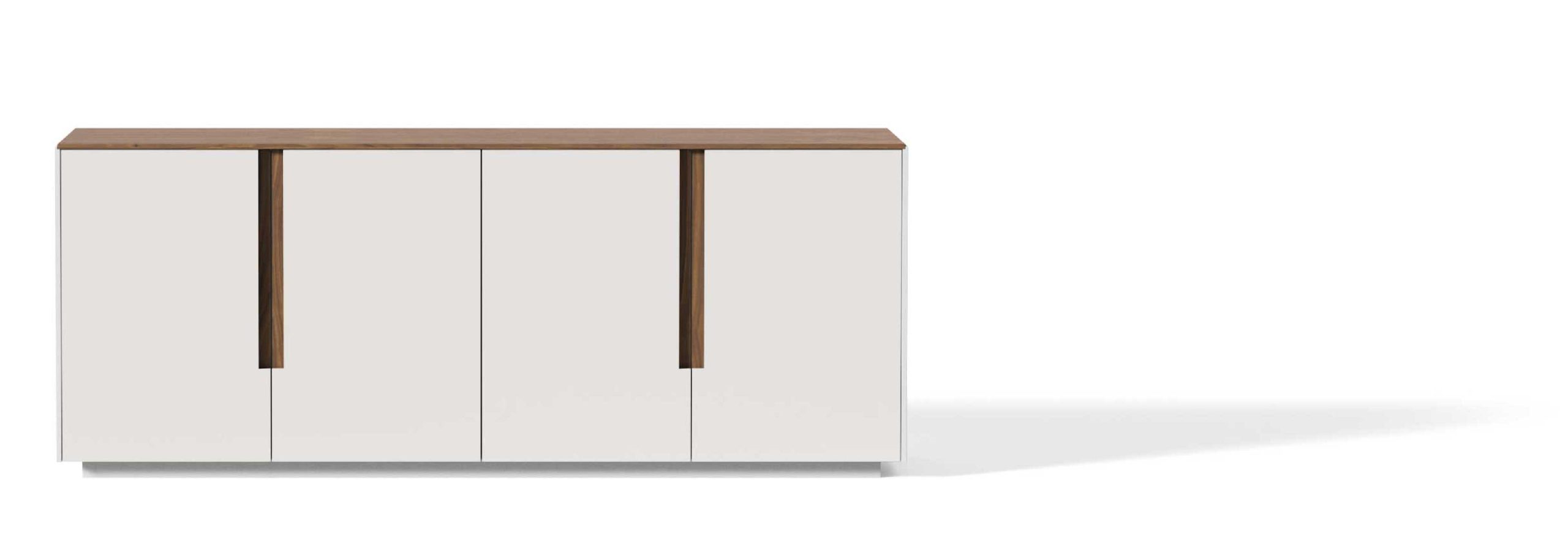 Collection characterized with doors with integrated handle and bottom panel in contrasting finish. Available in matt lacquered or wood finish.