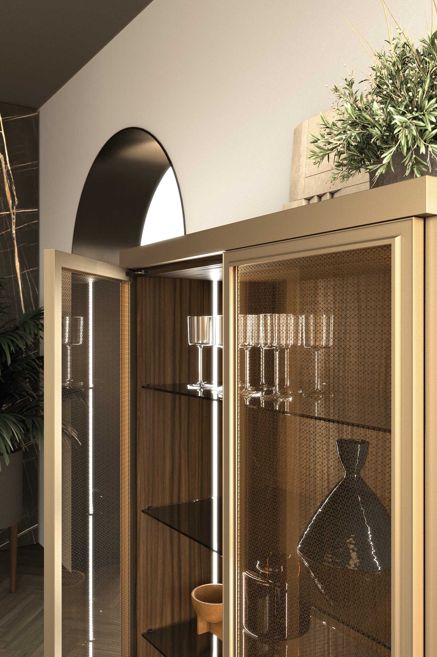The Baron sideboard consists of Evans air aluminum doors with bottom and top panel drowned hinges. The top tray is matt lacquered with an eco-leather pad. The Misty leg is made of anodized aluminum.