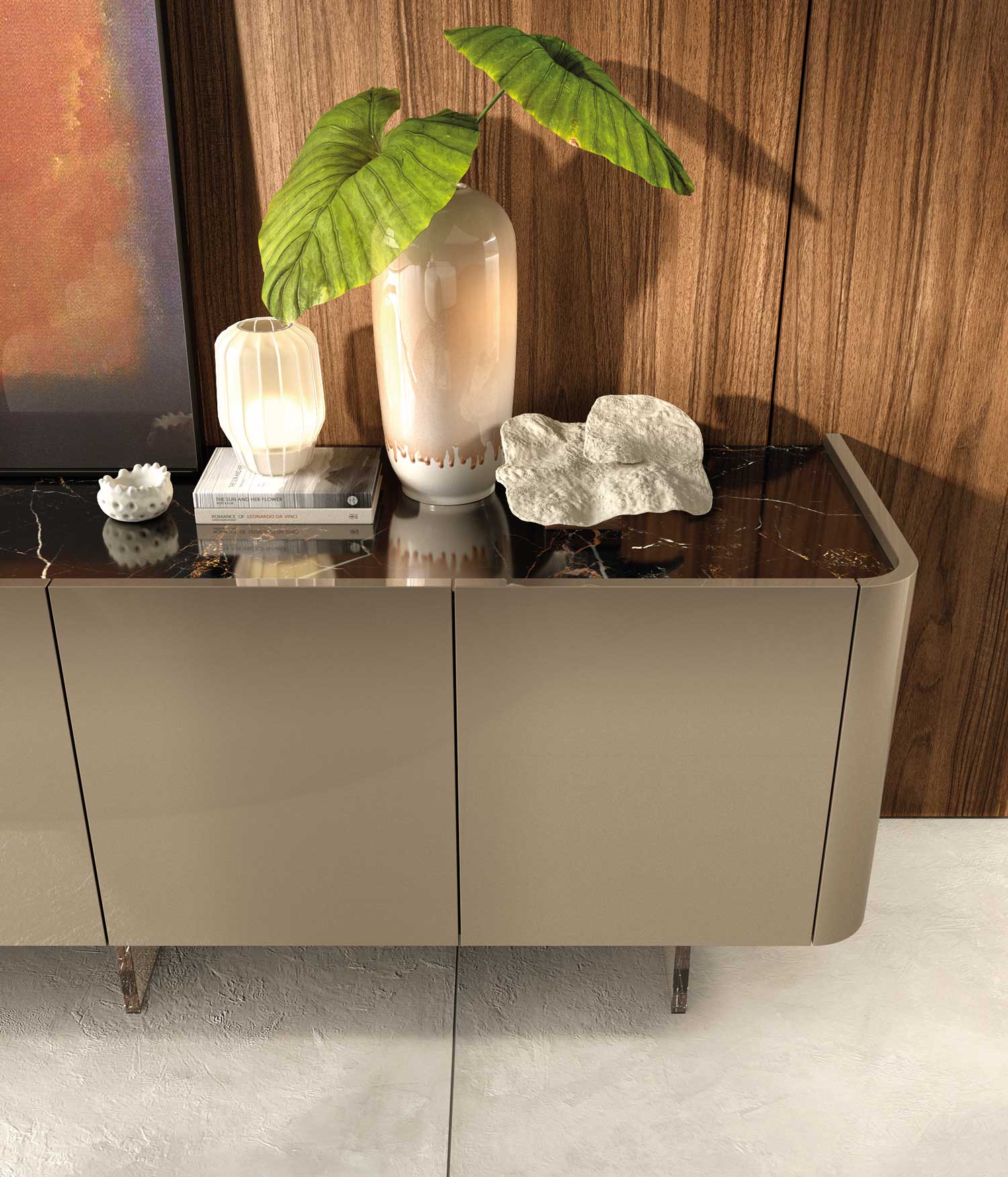 The coziness and charm of the curved surfaces of the Lovie sideboard fully merge with the lightness of the invisible legs. It is composed of matt and glossy lacquered doors and top, and the Floating legs are made of transparent methacrylate.