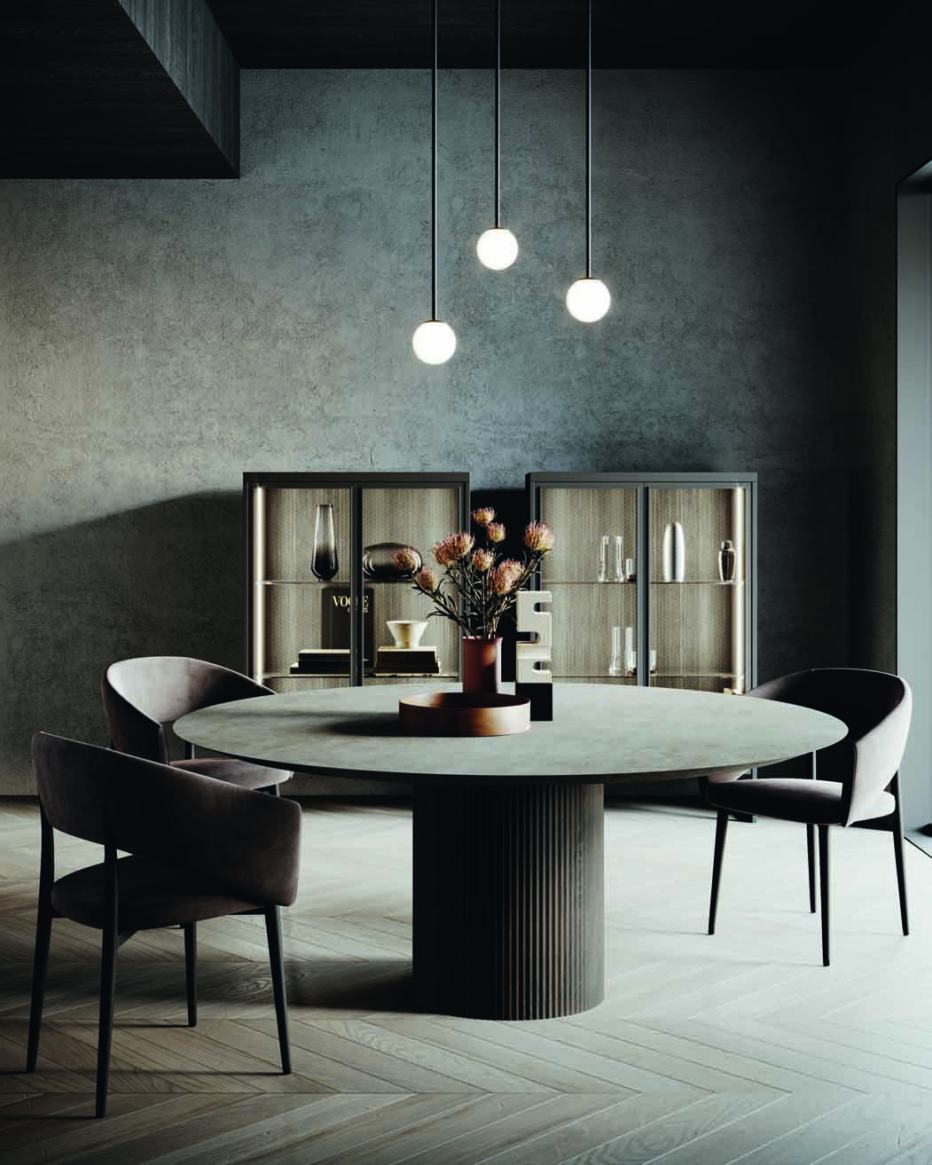 The Otis table consists of a cylindrical base available in matt lacquered, ribbed wood or eco-leather finish, while the top with tapered edge can be made of a matt lacquered, wood or porcelain gres finish.