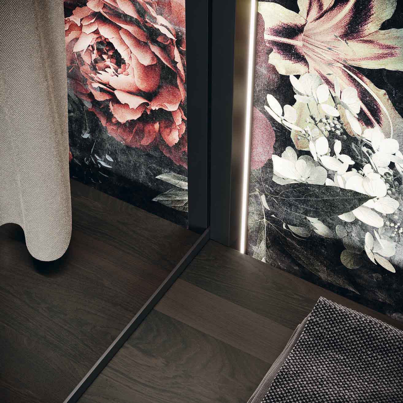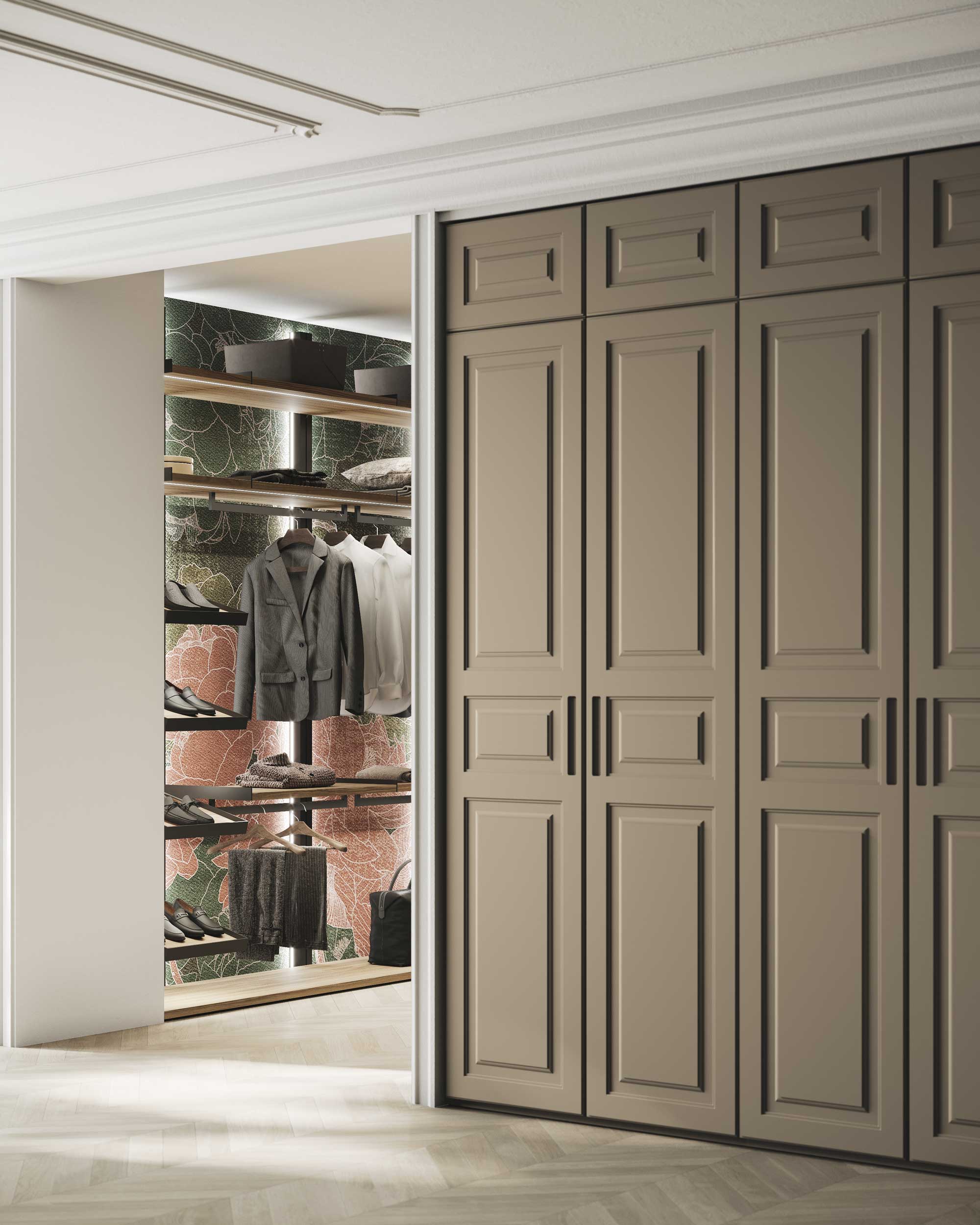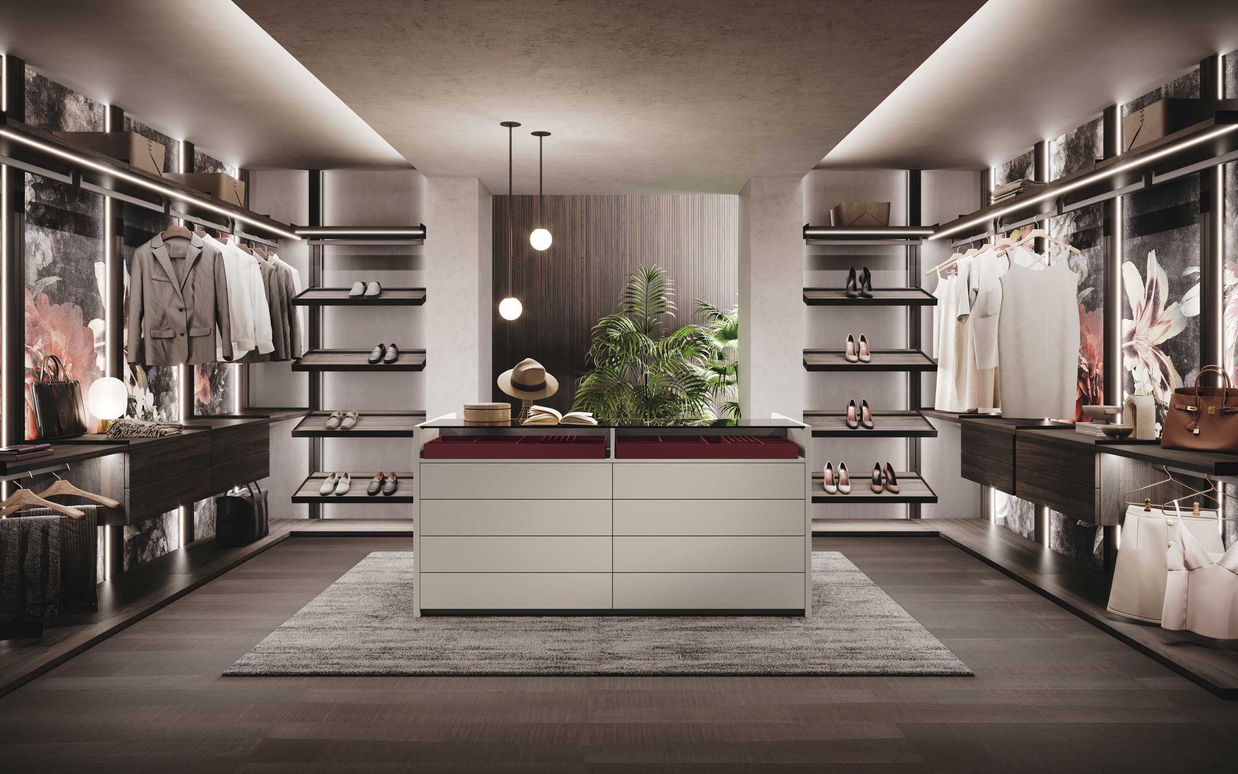 The Evidence is a walk-in wardrobe system consisting of racks covered with an MDF cover, attached by snap-on hooks. This product does not need cover panels and can be mounted the wall directly. Vertical LEDs are recessed on the cover.