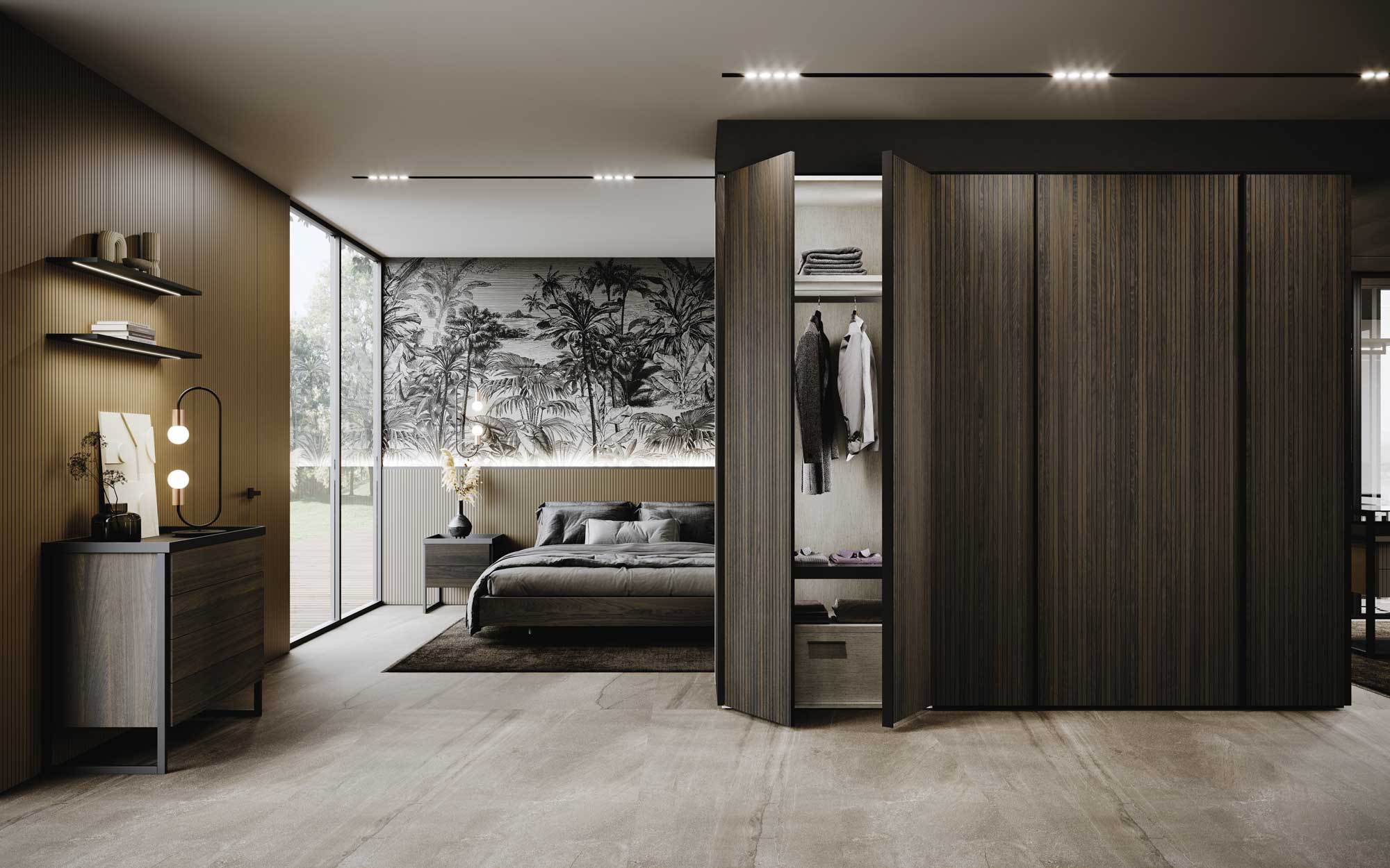 Always wardrobe in Dusty grey finish matt lacquer with Reflections handle in same finish and internal structure in Mandorlo bilaminate finish.