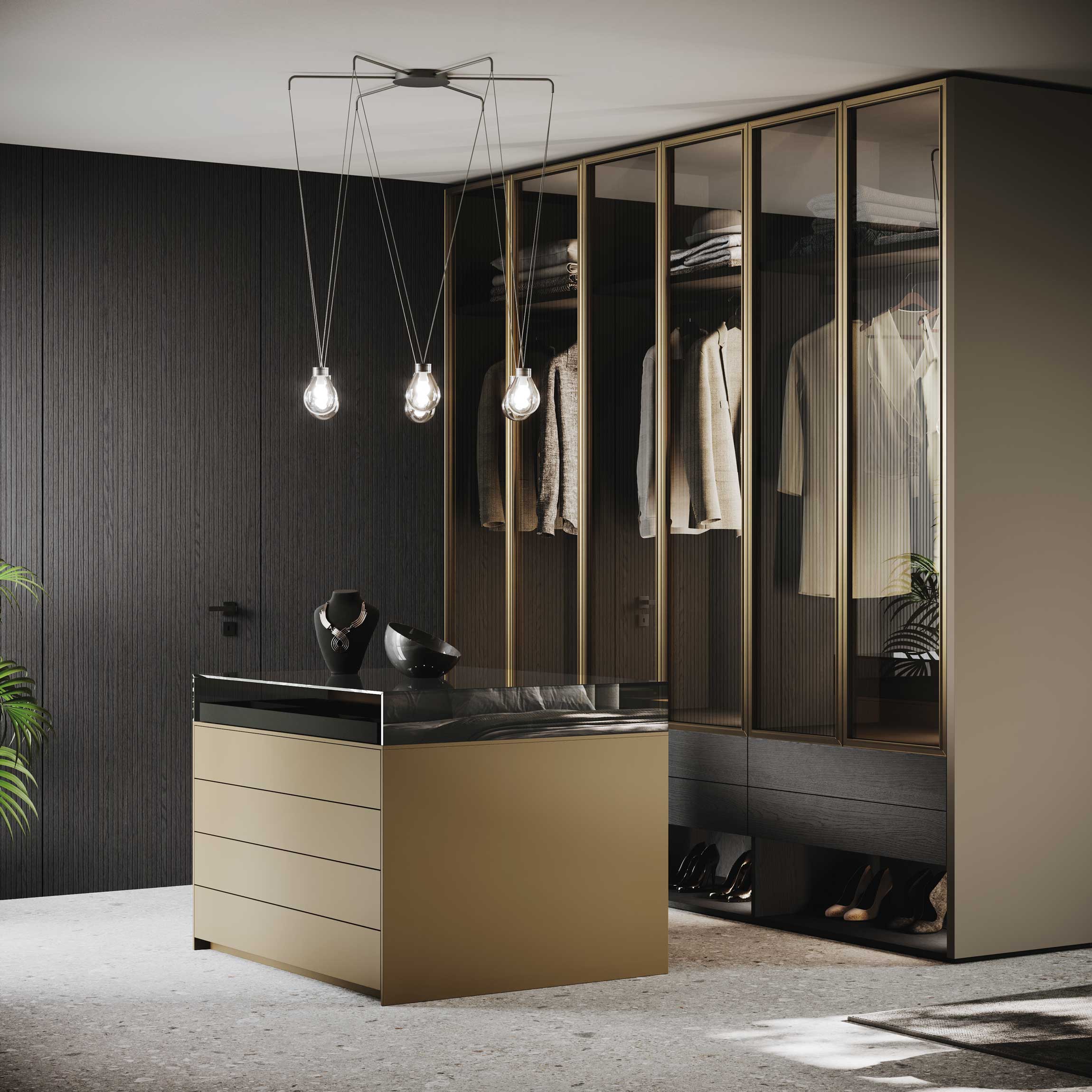 The Shadow-box model is a combination of several compartments: closed wardrobe at the top with Evans Air aluminum-glass framed door, underneath push-pull drawers and later open space used as a shoe rack.