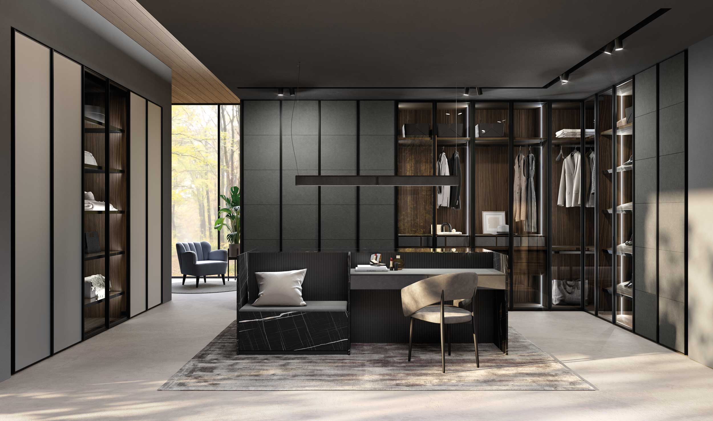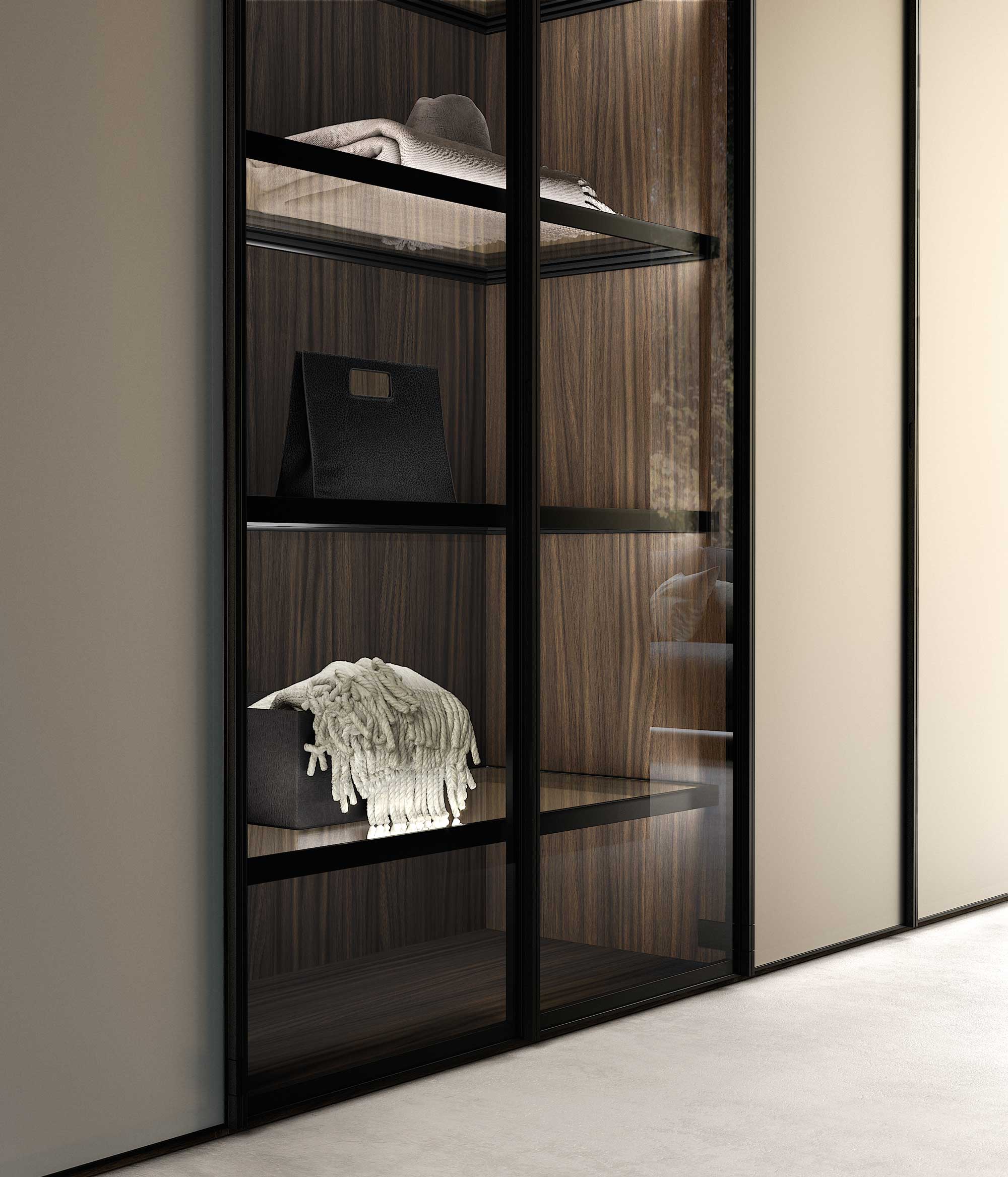 The Shine wardrobe door is composed of an aluminum framewith integrated handle grip that holds a 4 mm thick glass panel or eco-leather panel. Opening is provided by means of 180ยฐ soft closing hinges.
