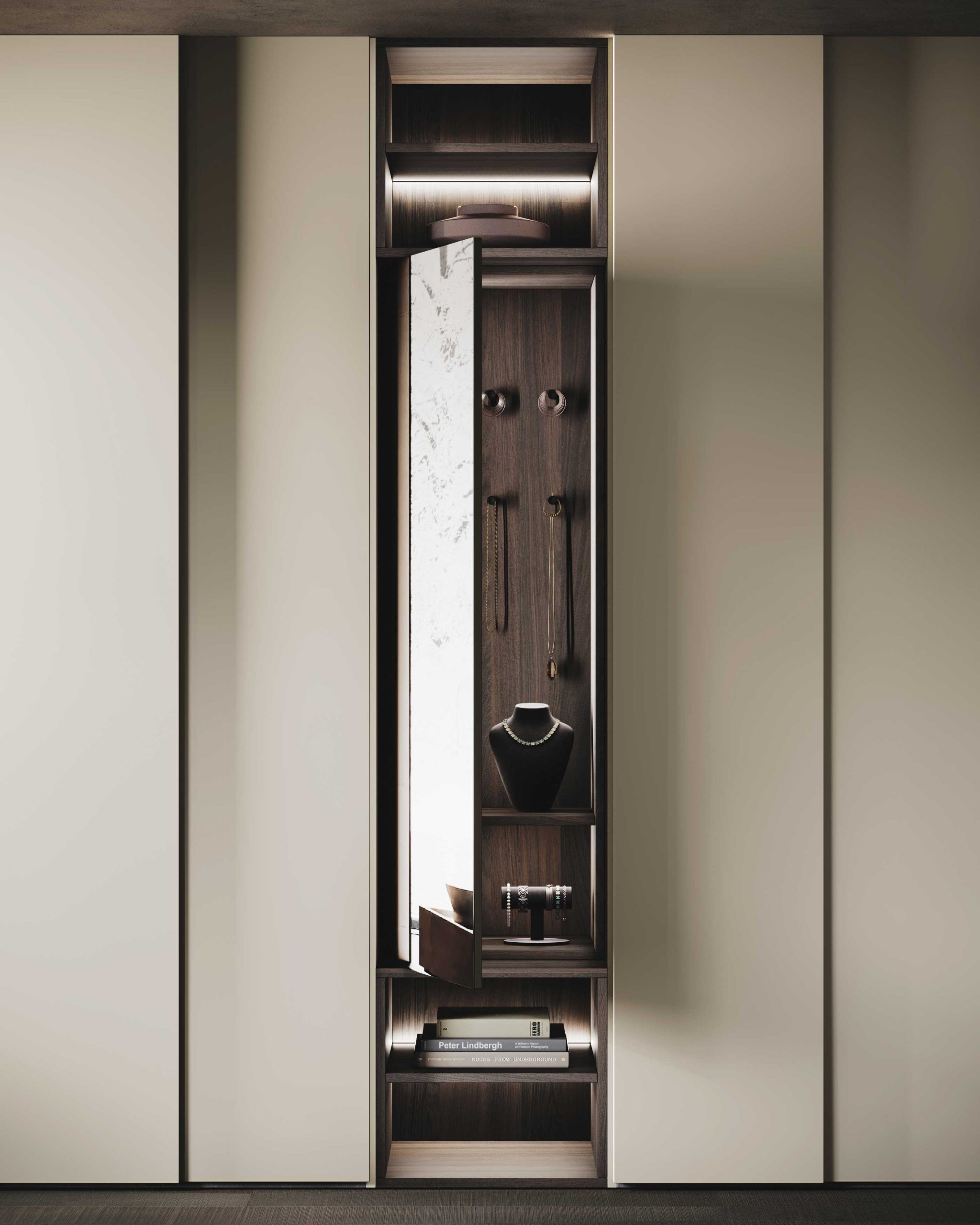 The Wave wardrobe always consists of two doors, one 19 mm thick and the other 30 mm thick and 45ยฐ profile with aluminum profile with aluminum profile.