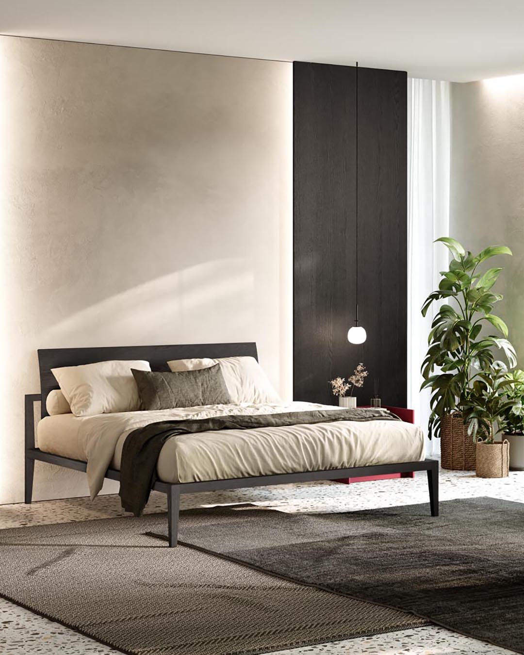 A light and elegant frame structure supports the inclined back of the Thelonious bed in wood Frassino Nero finish.