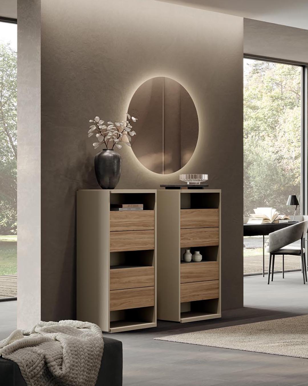 Above the chests of drawers, made up of four suspended drawers in bilaminate NT finish and structure in matt lacquered Sahara BG, there is the Boogie mirror in bronze scf.