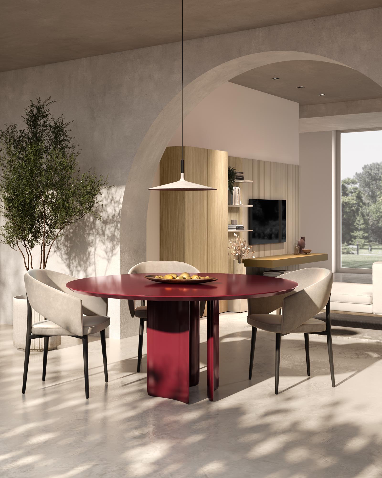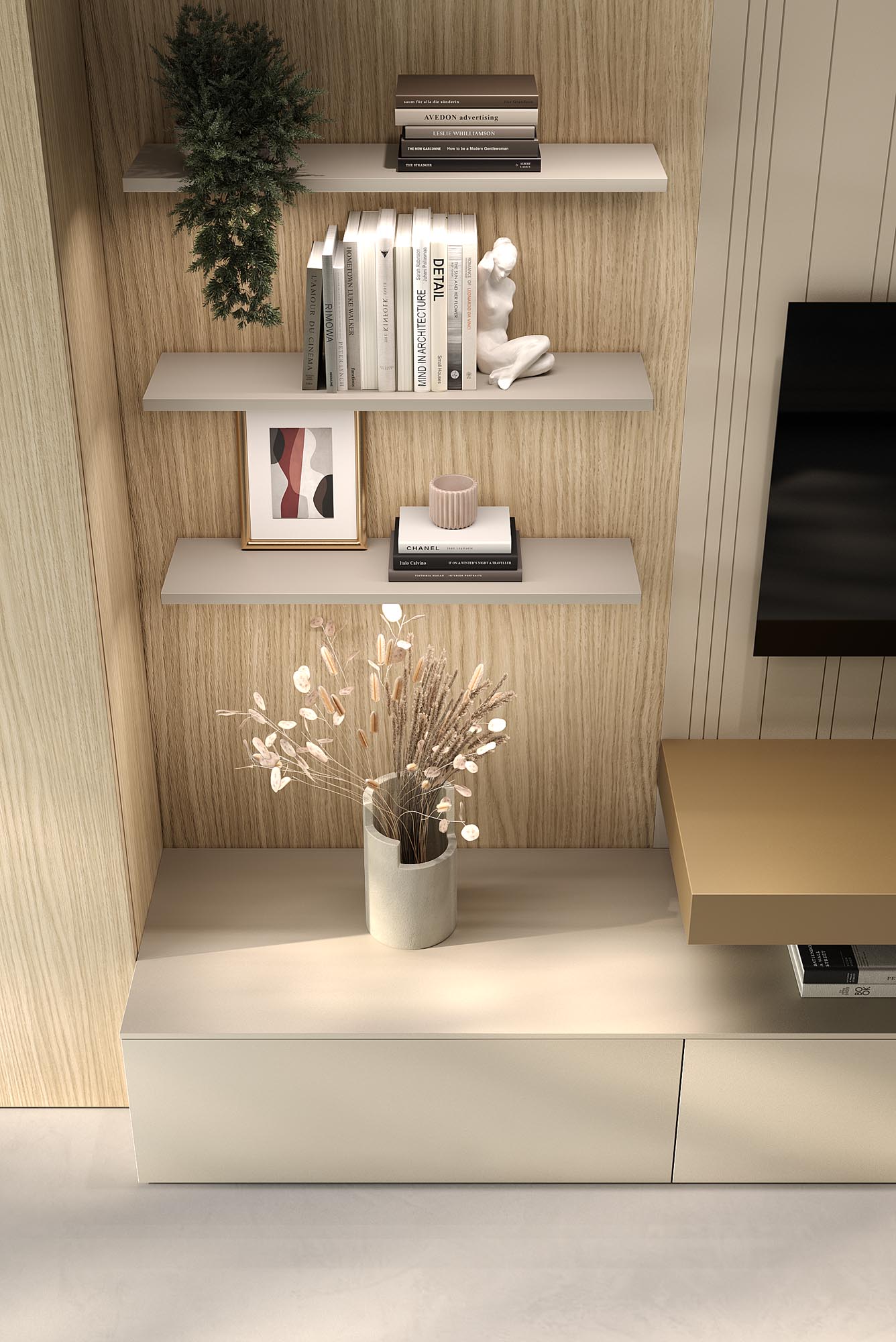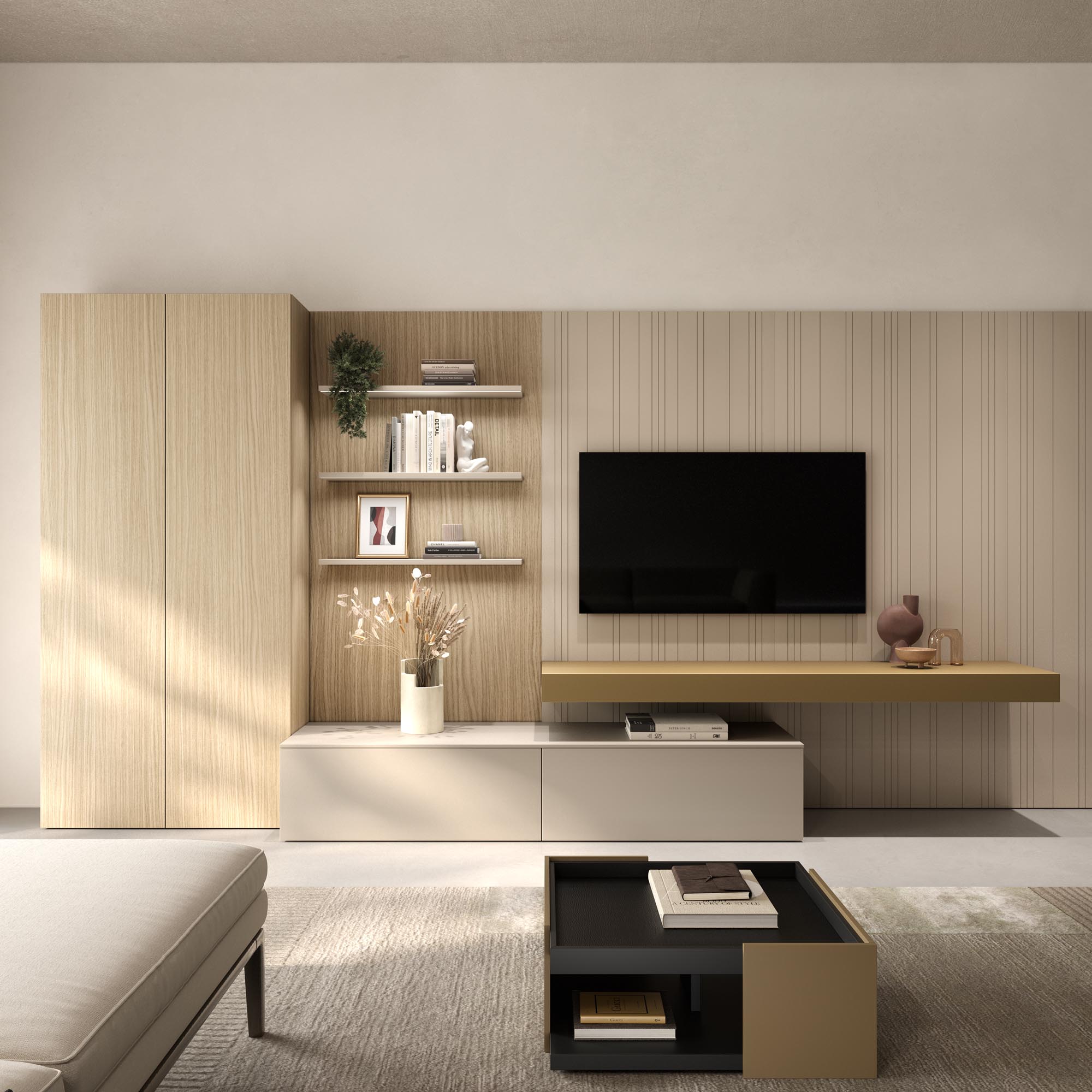 Composizione living costituita da boiserie TEMPO e mobili contenitori in laccato opaco Sahara BG. Boiserie FLAT con mensole e colonne in bilaminato Rovere Japan. Piano FOLDING in laccato opaco Bronzo.