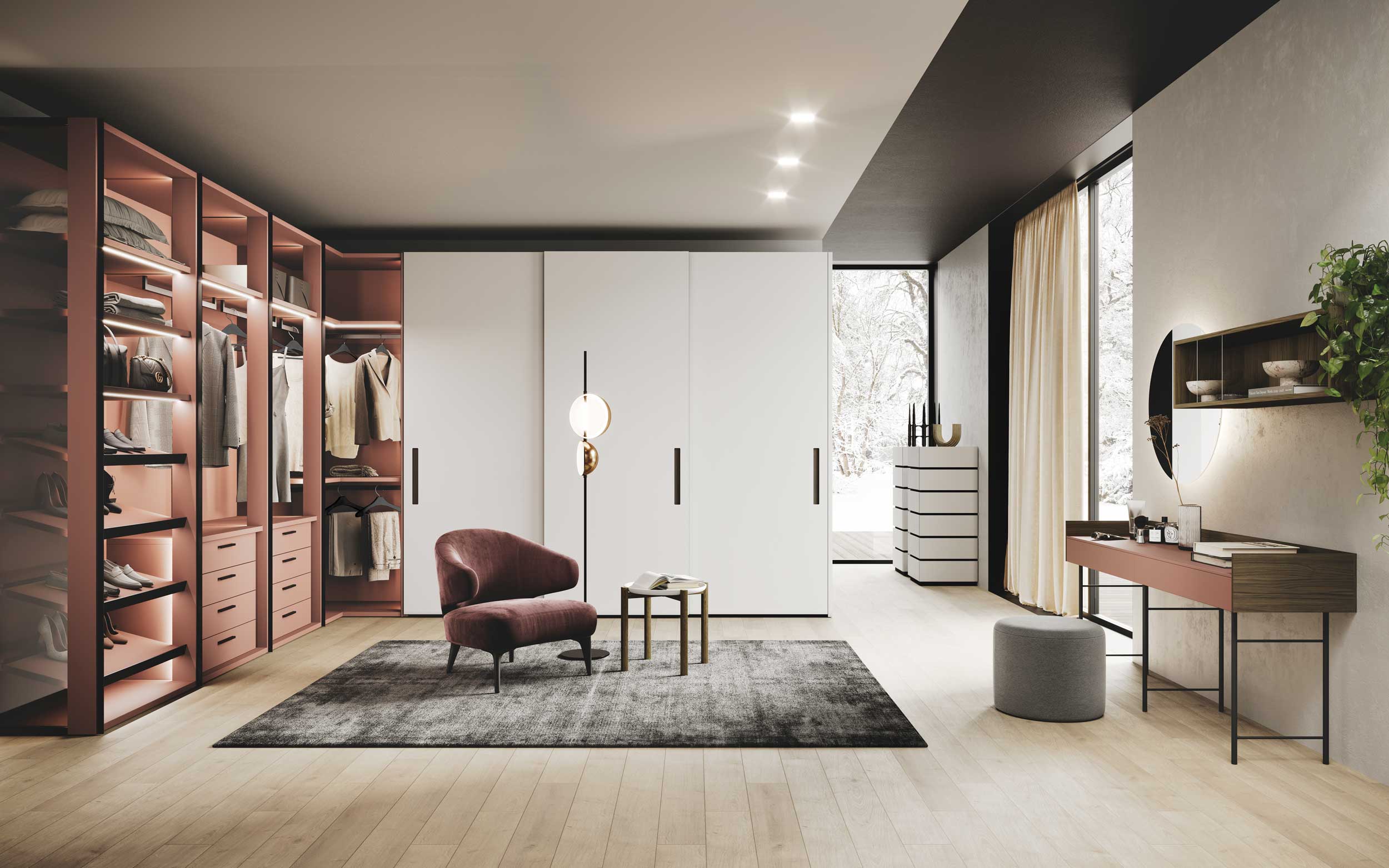 Armadio Unlimited senza ante in laccato opaco e armadio scorrevole Bebop-s con maniglia integrata, scrittoio OโDay con vani a giorno pensili e settimini della collezione Koko.