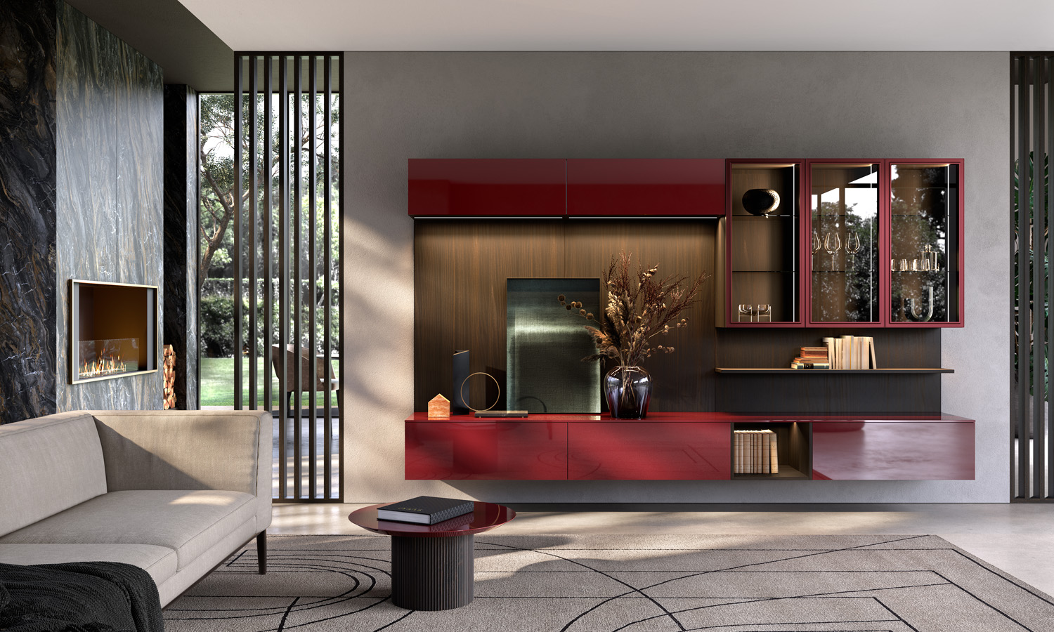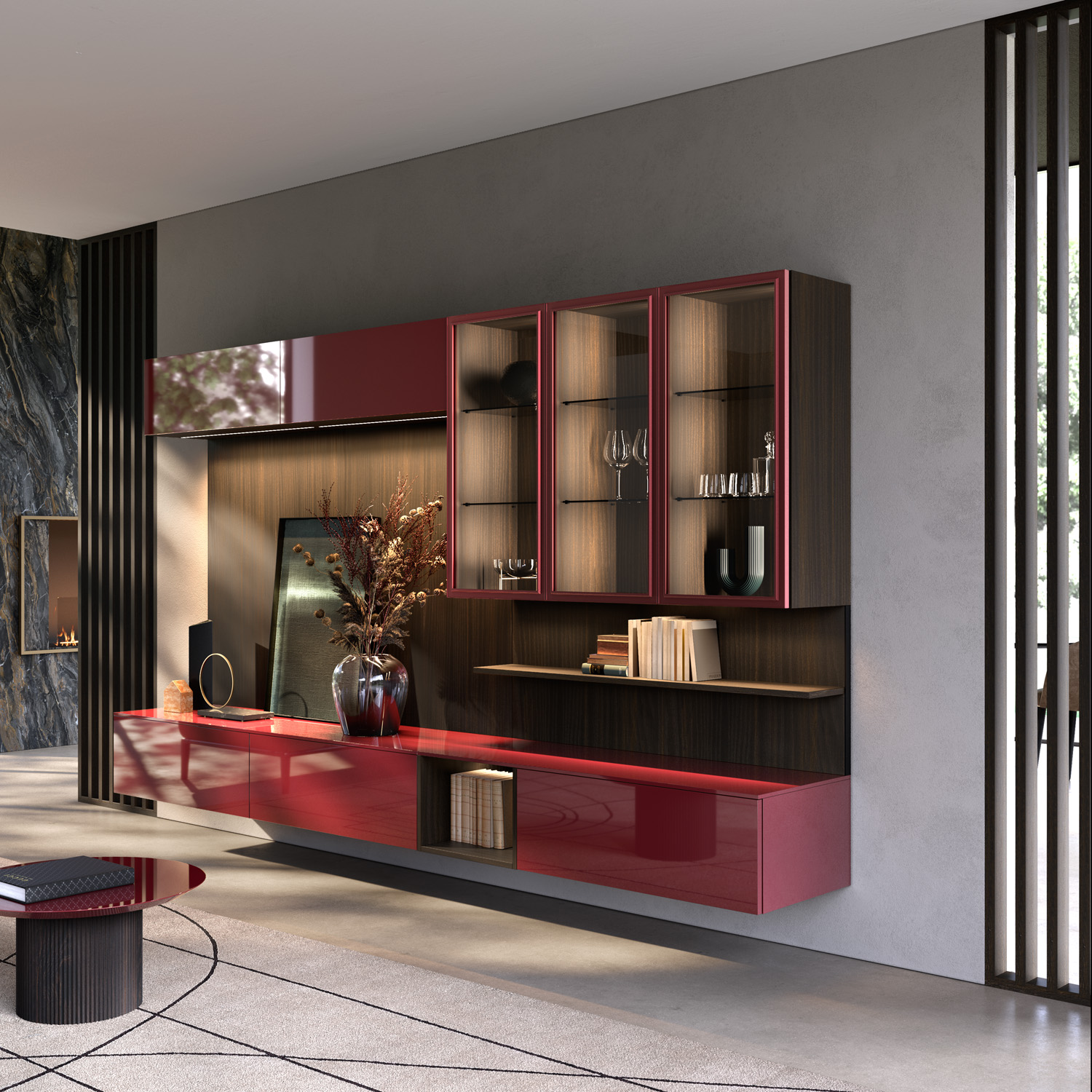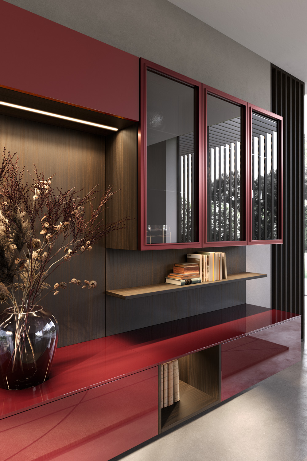Pensili in bilaminato Rovere CB con ante EVANS AIR in alluminio laccato metallico Amarena e vetro Fumรจ.